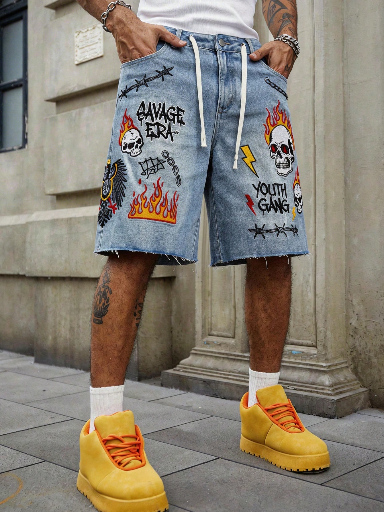 Pantalones cortos de mezclilla bordados con estilo urbano para hombres