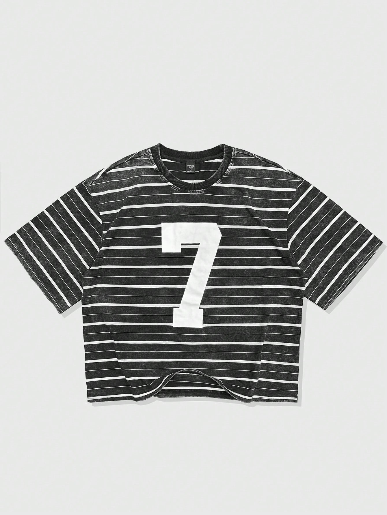 Camiseta casual de cuello redondo de manga corta con estampado de rayas y números para hombres