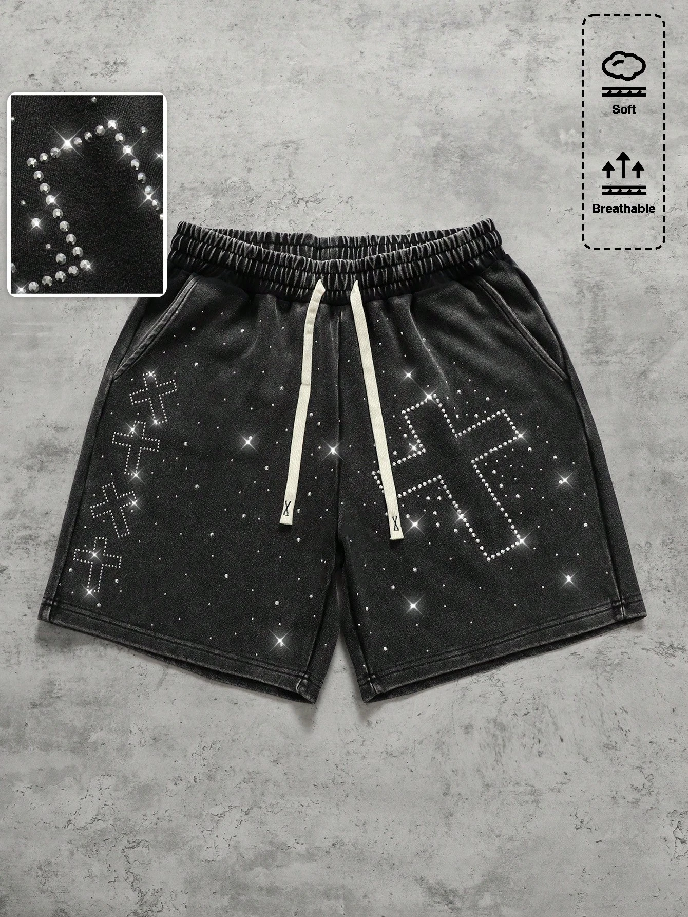 Pantalones cortos casuales de verano para hombres con cordón en la cintura y adorno de cristales en forma de cruz