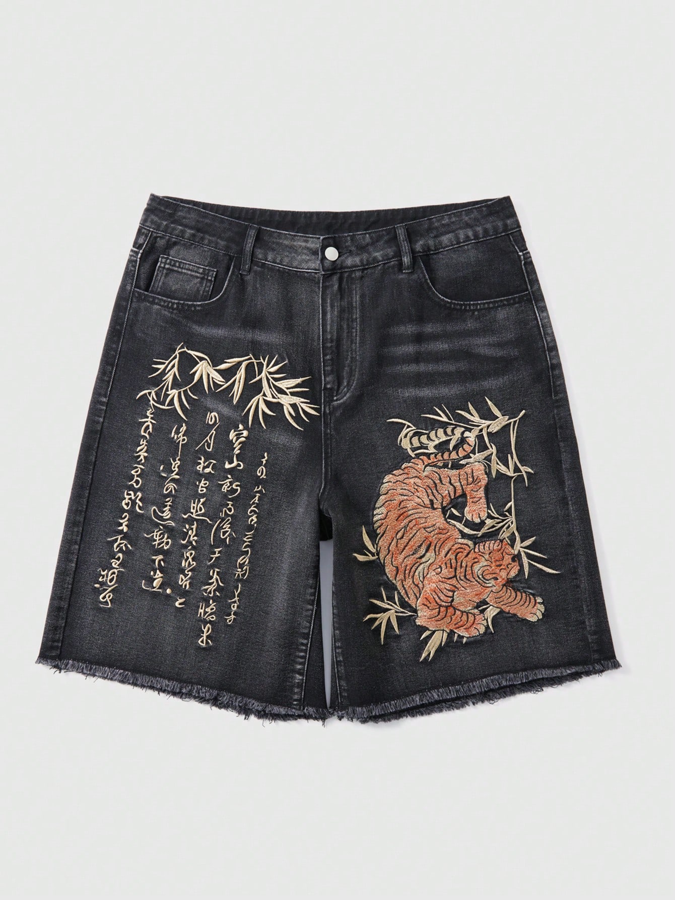 Pantalones cortos vaqueros casuales y versátiles con bolsillo bordado de tigre y dobladillo deshilachado para hombres