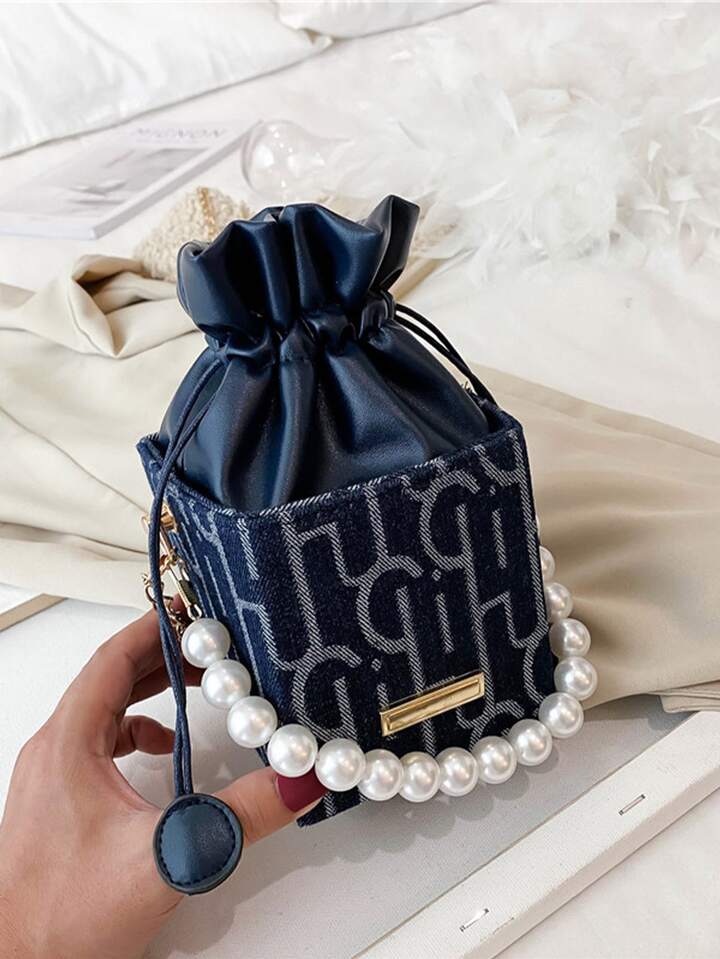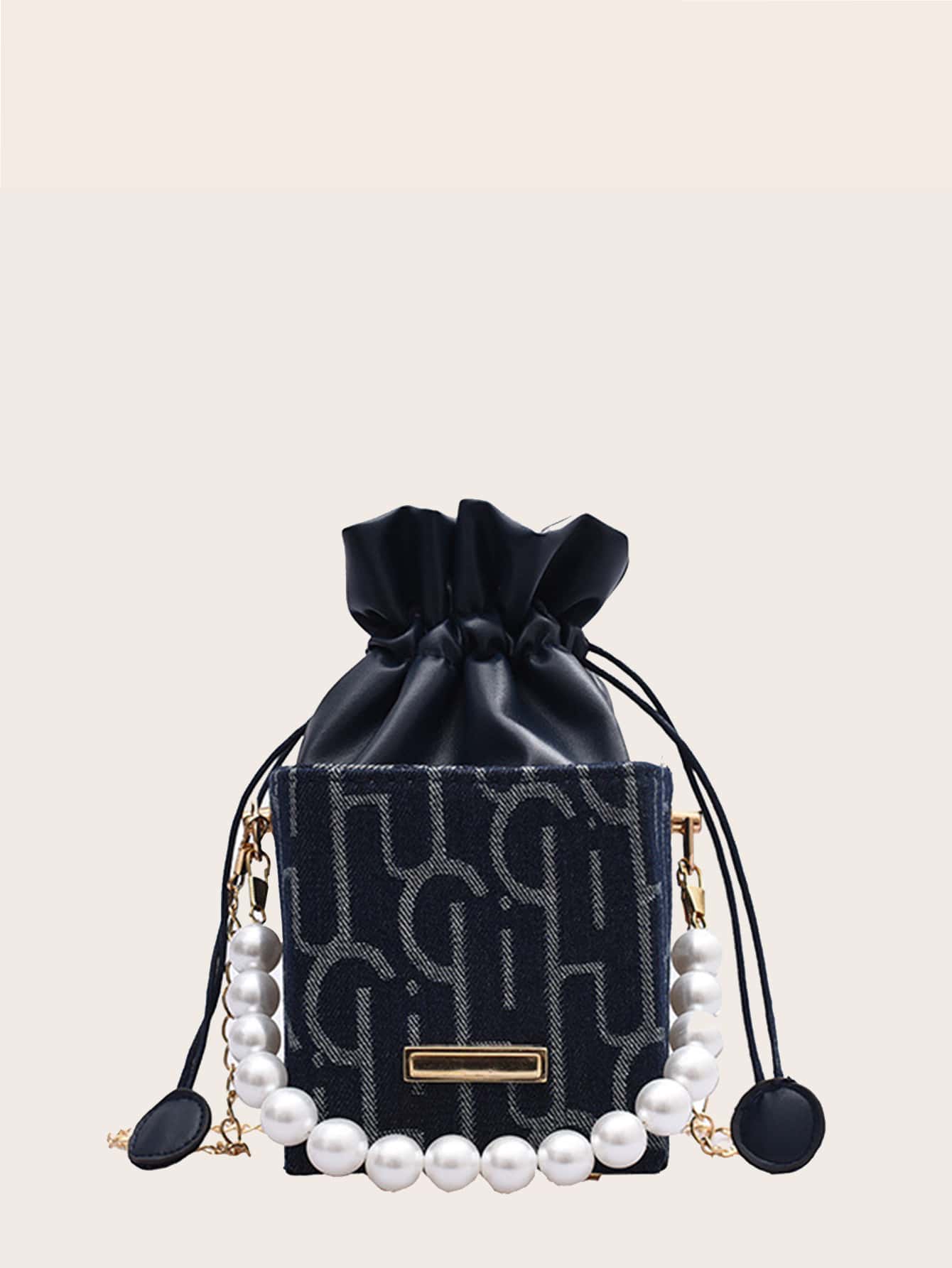 Bolso caja mini de metal & con diseño de perla artificial con diseño de cordón con cadena