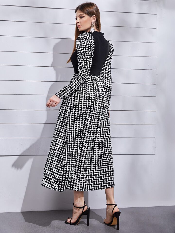 Vestido de noche largo con cuello cisne, manga abullonada y estampado pata de gallo