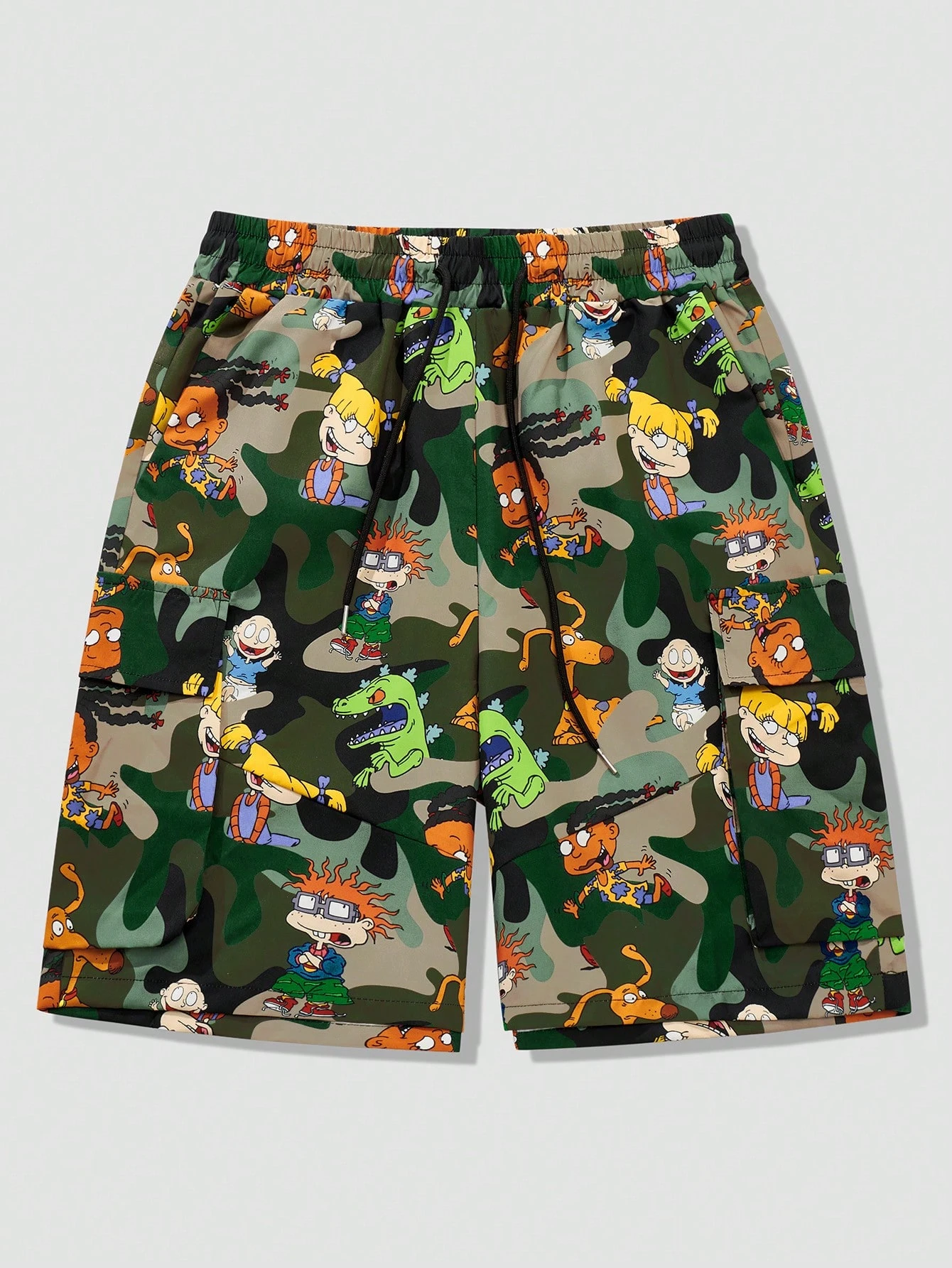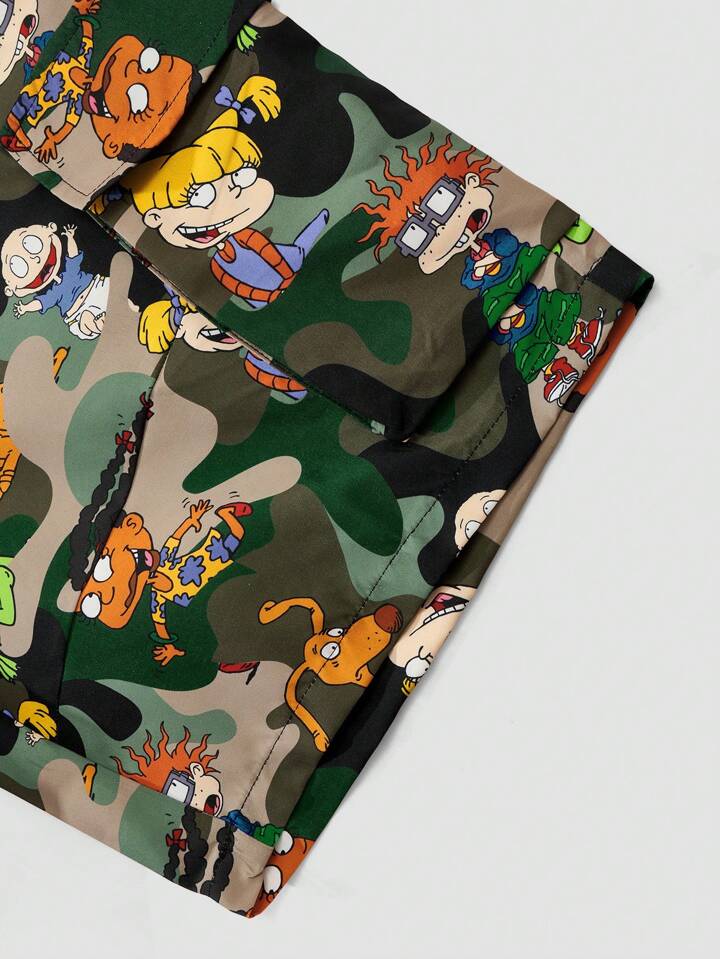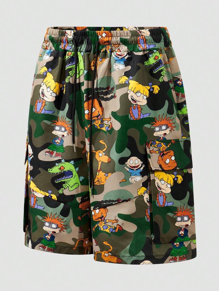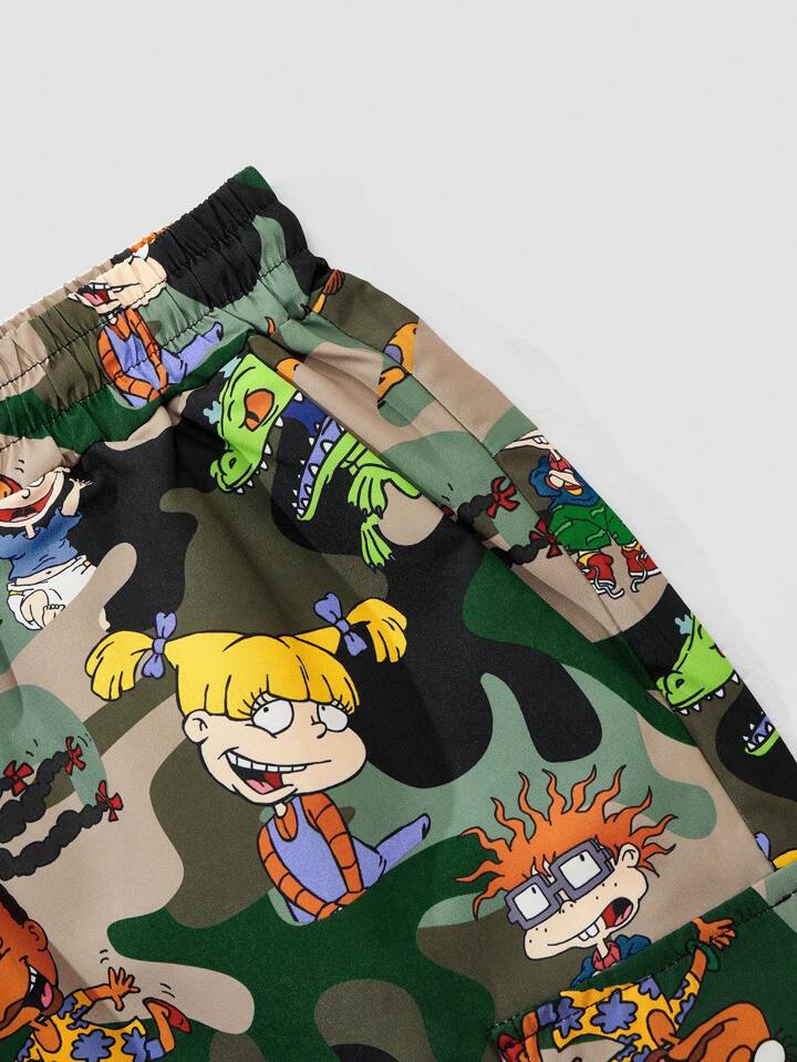Nick 90's X ROMWE Pantalones cortos deportivos con diseño de camuflaje y dibujos animados, aptos para uso diario en primavera y verano