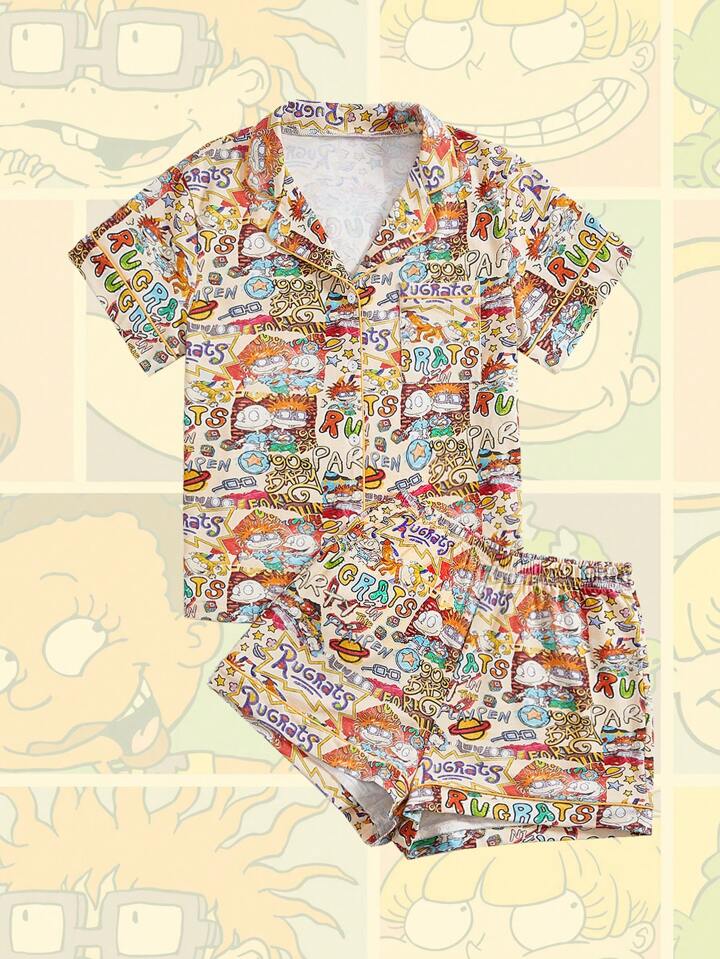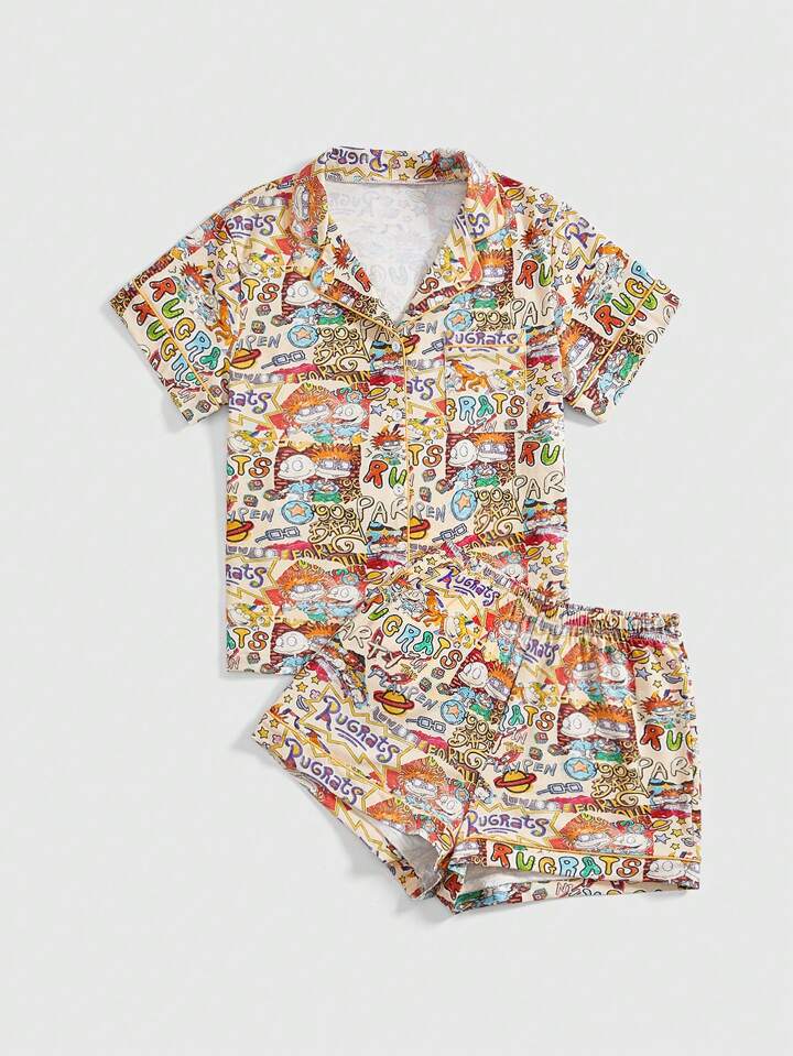 Nick 90's X ROMWE Conjunto de pijama de 100% algodón, con camisa de estilo corto y manga corta con estampado de dibujos animados, y pantalones cortos