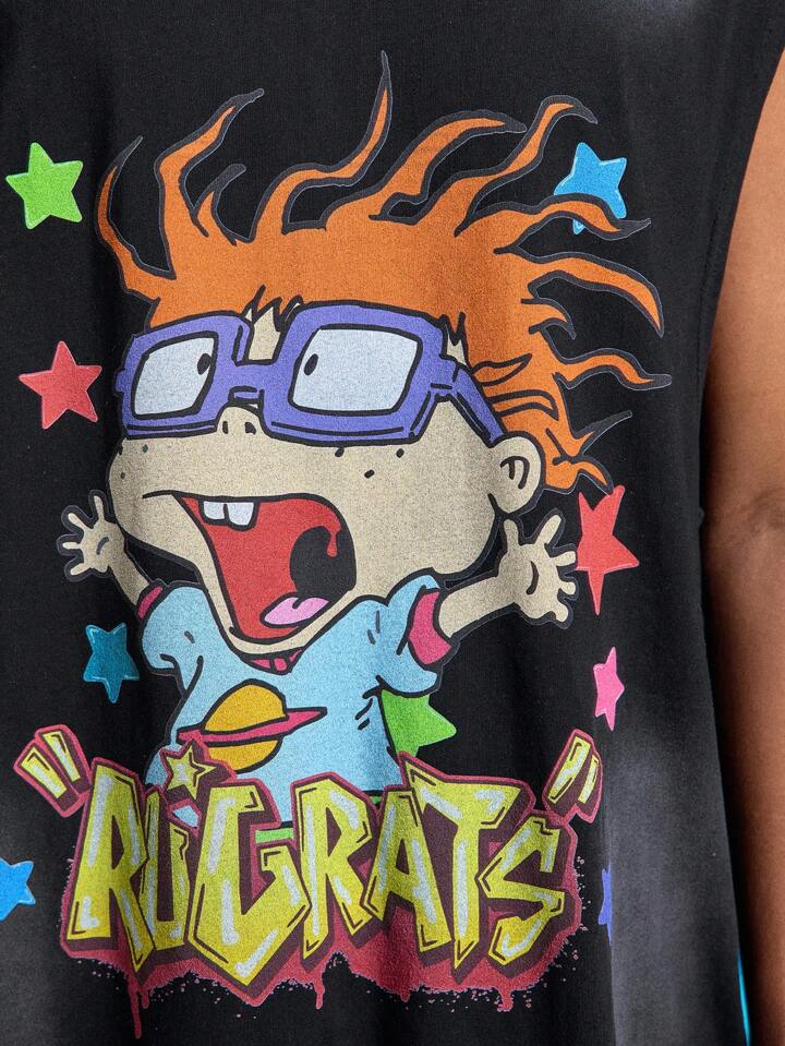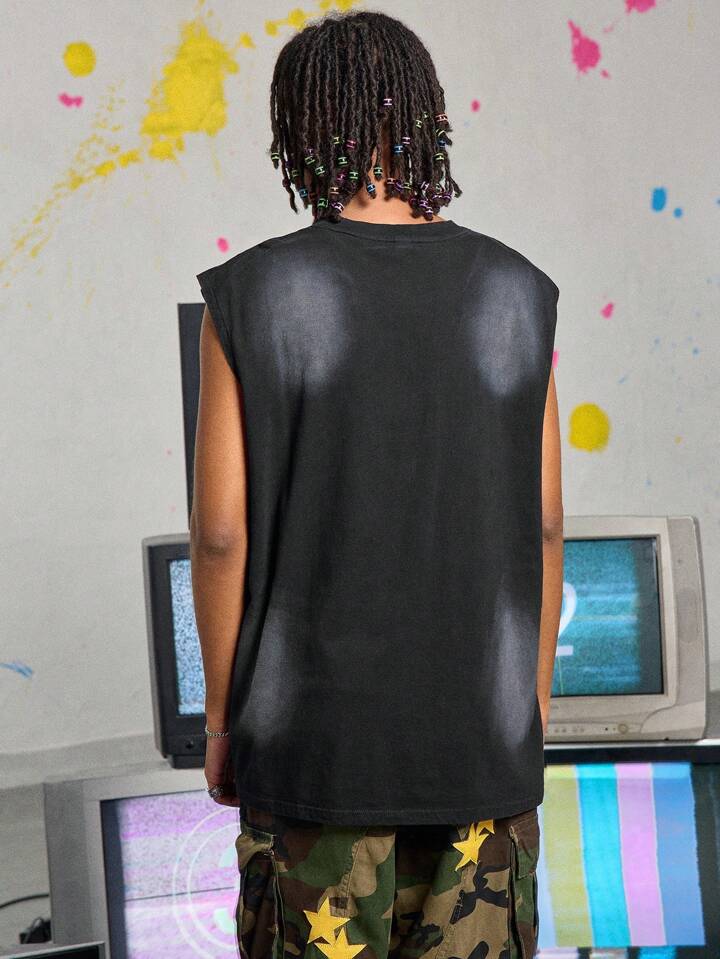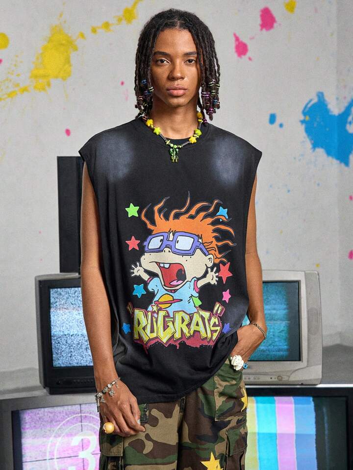 Nick 90's X ROMWE Camiseta de tirantes con estampado de dibujos animados lavada en nieve para hombre, apta para uso diario
