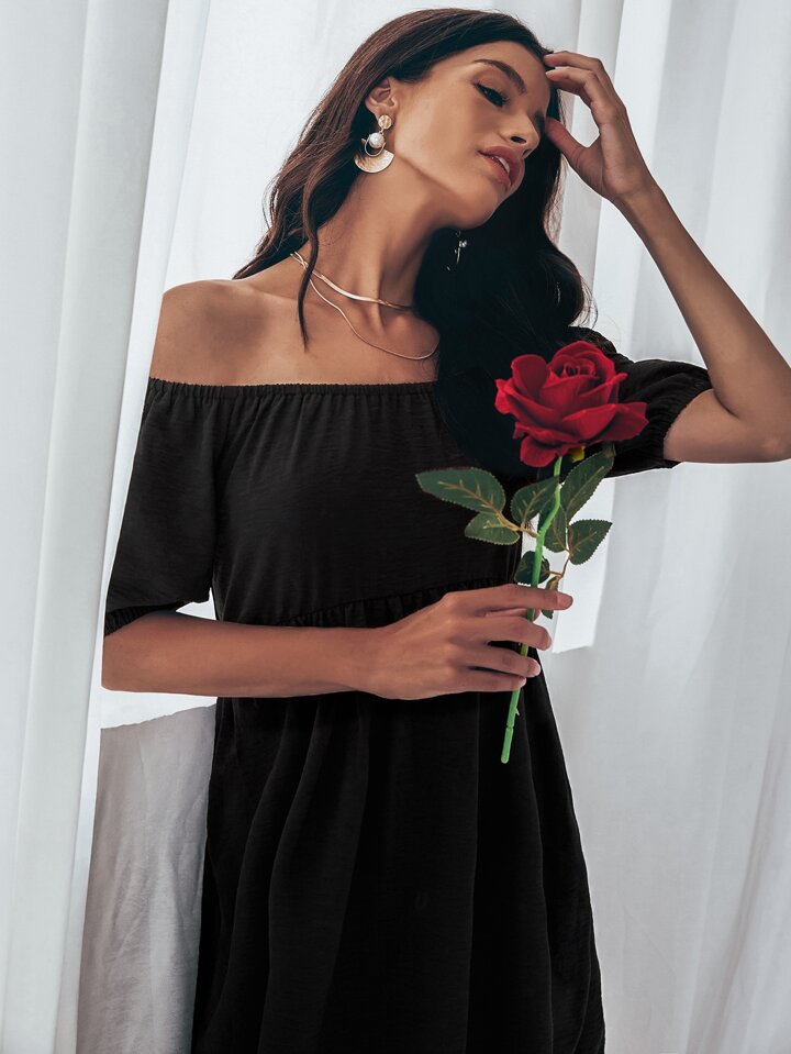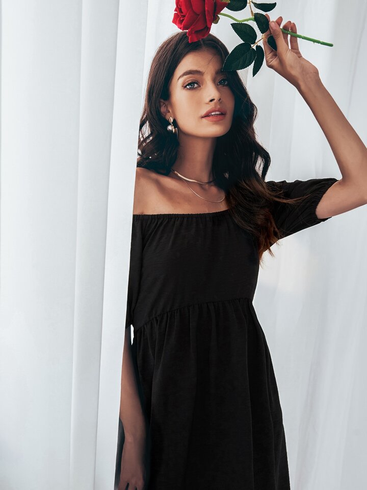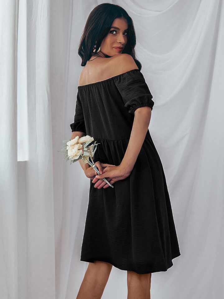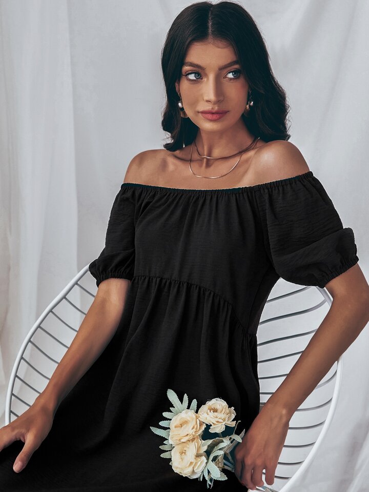 Vestido Delicado Holgado Con Cuello Descubierto Y Mangas Abullonadas