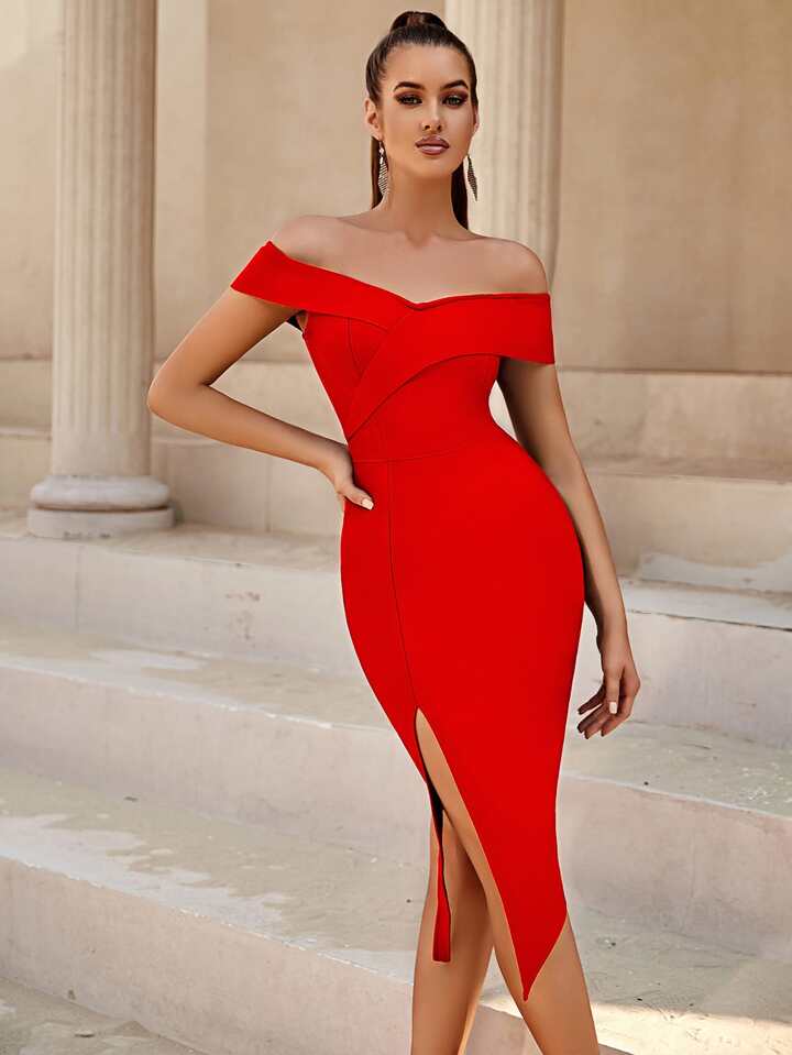 Vestido ceñido al cuerpo con hombros descubiertos y abertura en el muslo con cremallera en la espalda para cóctel