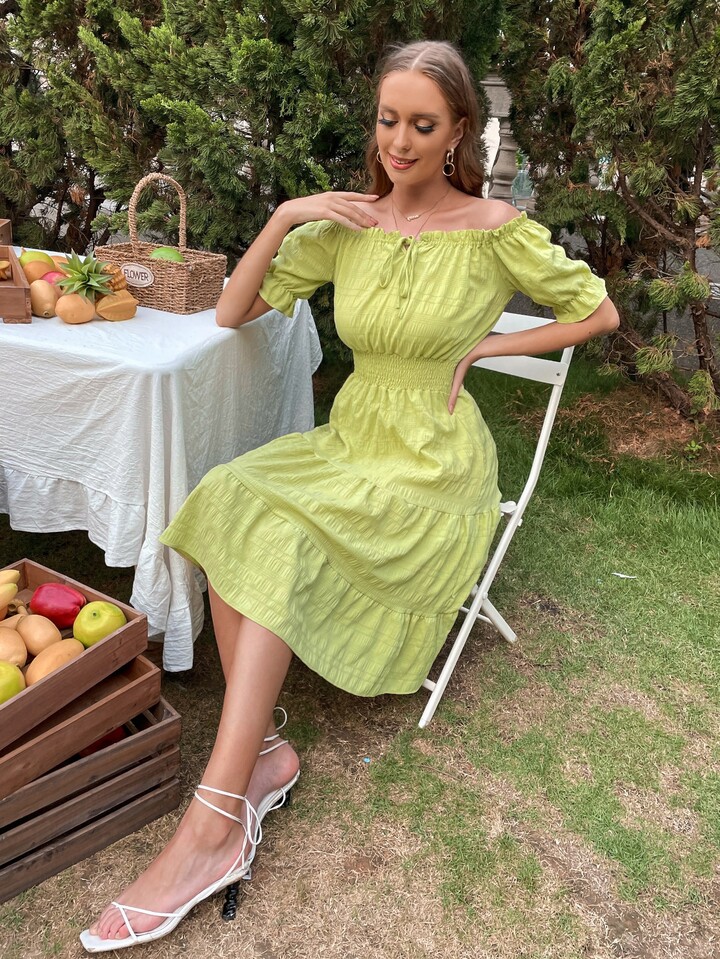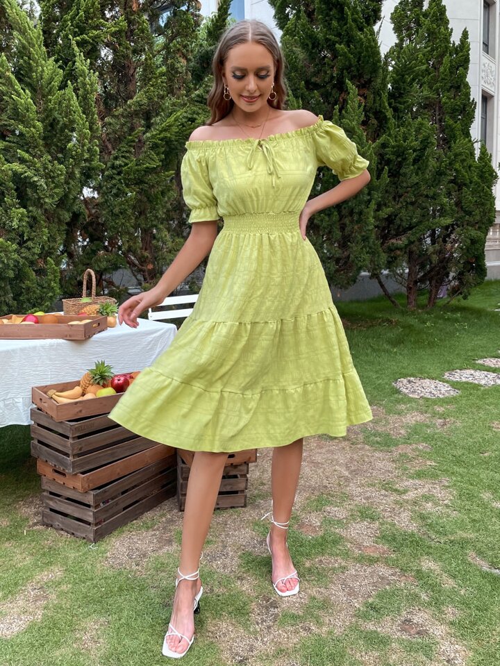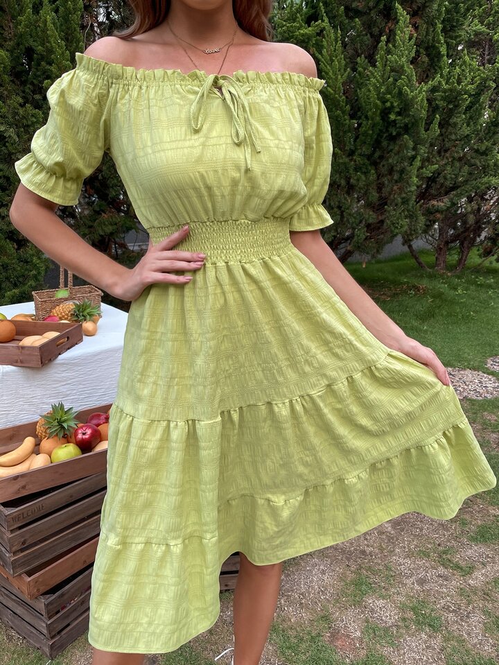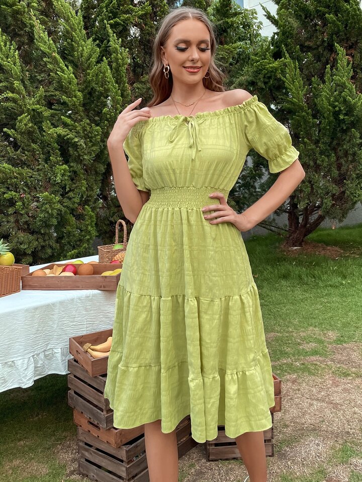 Vestido de hombros descubiertos de cintura fruncido bajo con fruncido