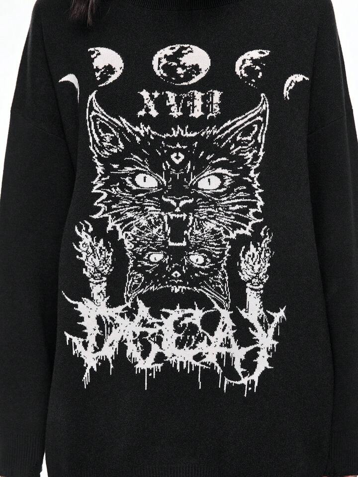 Goth Suéter holgado con diseño desgastado de cabeza de gato gótico