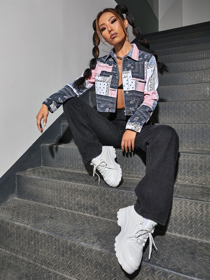 Cazadora mezclilla con estampado de paisley con retazo con botón delantero