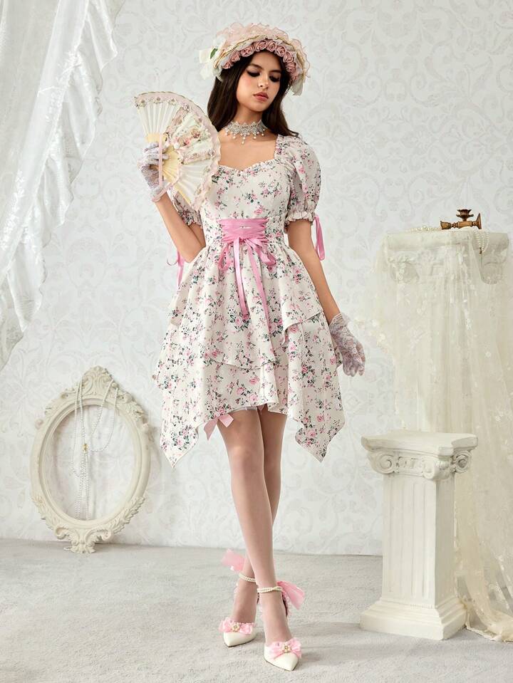 Vestido elegante con escote cruzado, cintura elástica y dobladillo asimétrico con estampado floral diminuto, para té