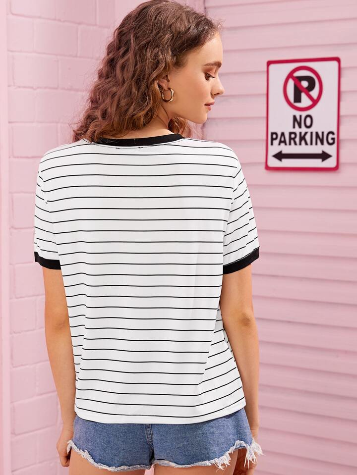 Camiseta de cuello redondo a rayas con bolsillo parche