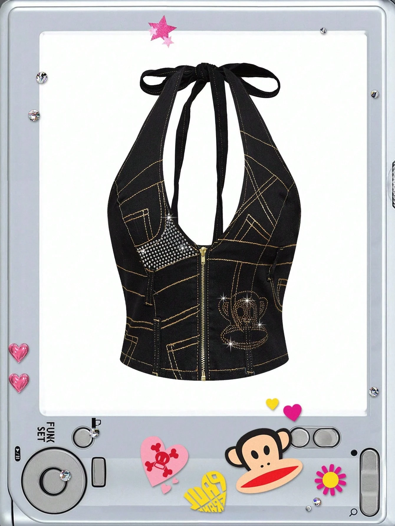 Paul Frank X ROMWE Top de mezclilla con escote halter y patrón de mono con rhinestones estilo Y2K para mujer