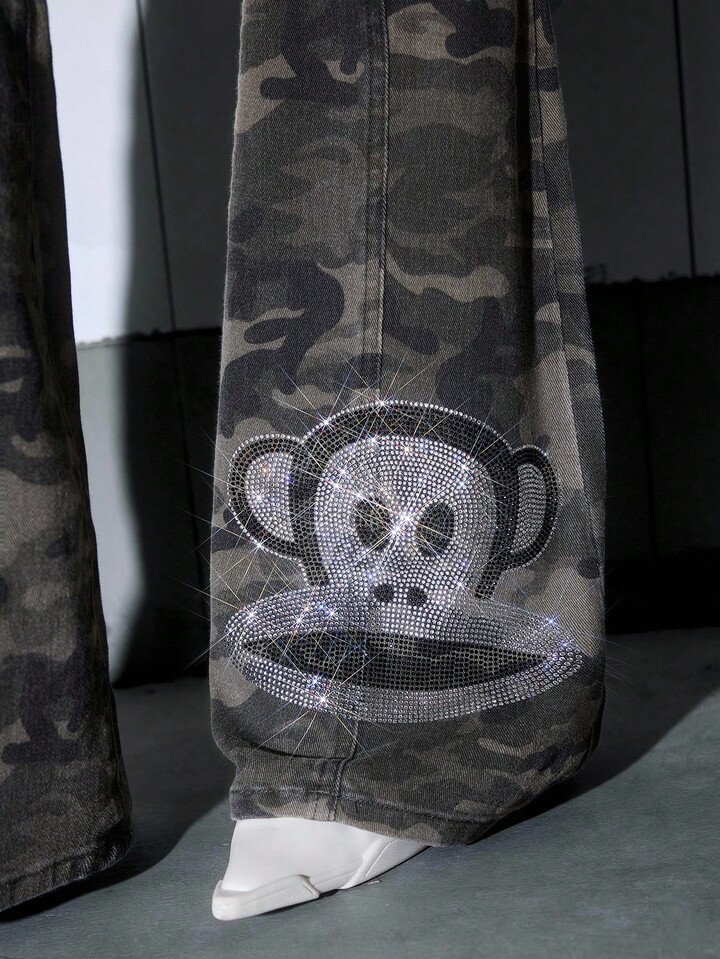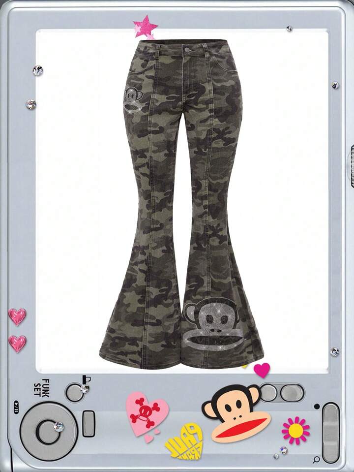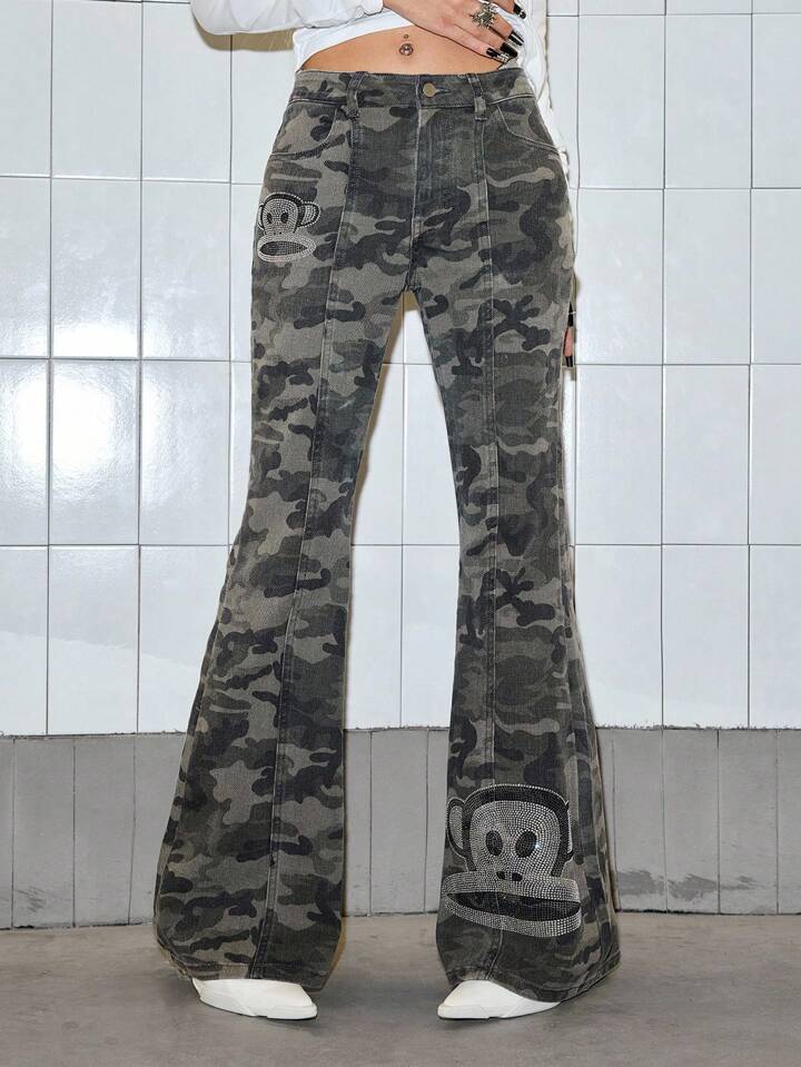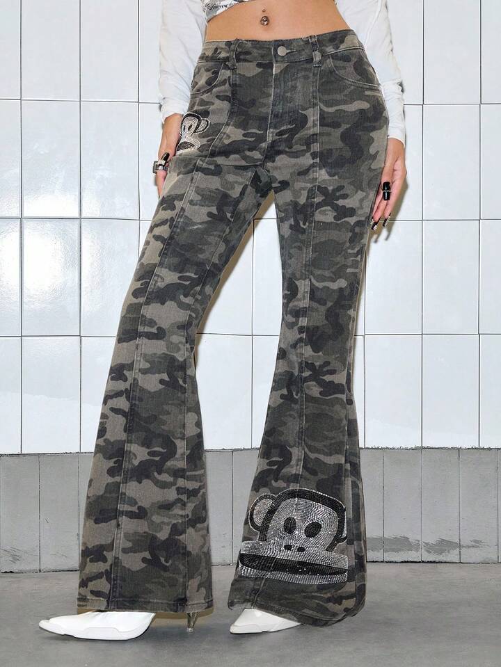 Paul Frank X ROMWE Jeans acampanados de tiro súper bajo con camuflaje de strass para mujer, estilo Y2K