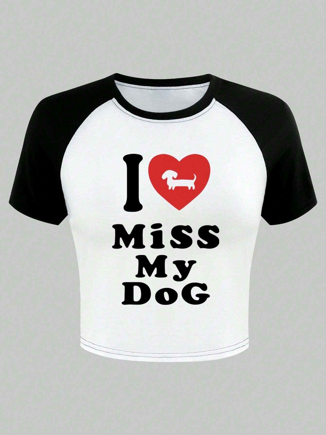 Camiseta Suelta Con Cuello Redondo, Estampado De Mascotas Y Eslogan, Cintura Ajustada Y Manga Raglán Con Bloques De Color.