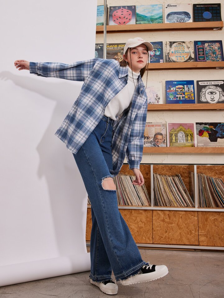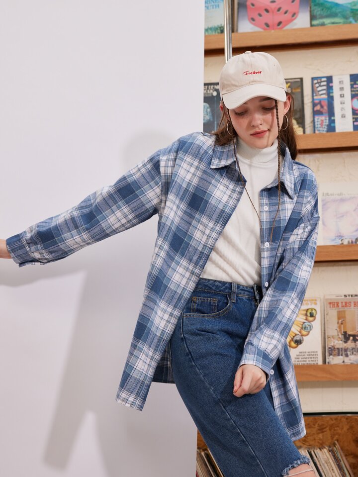 Camisa de botones con hombros caídos a cuadros, ropa de otoño, franela, blusa de manga larga para mujer