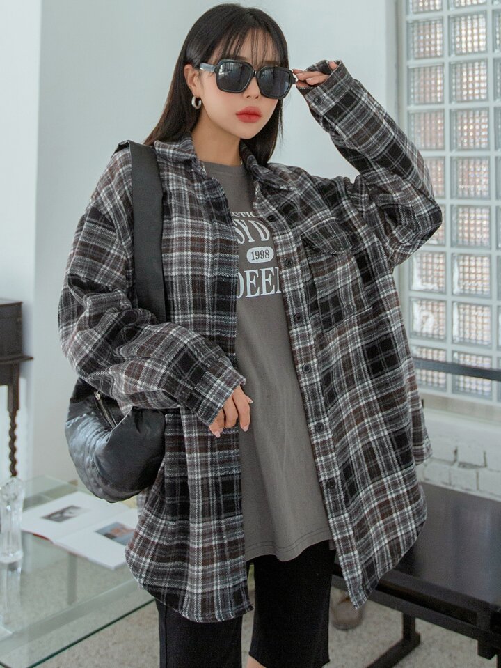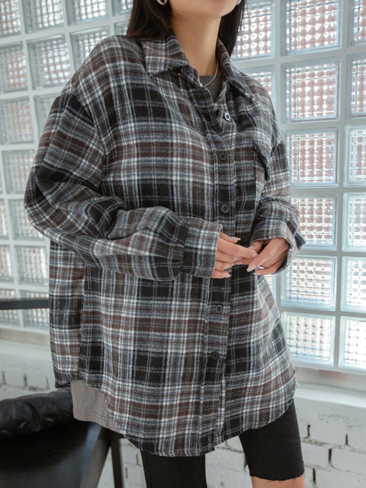 Camisa de manga larga con estampado de cuadros y hombros caídos para mujer