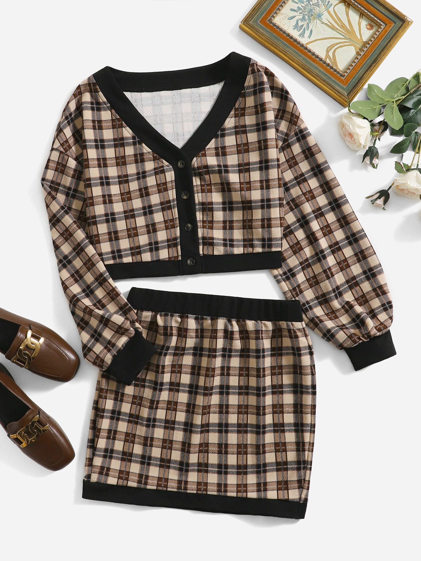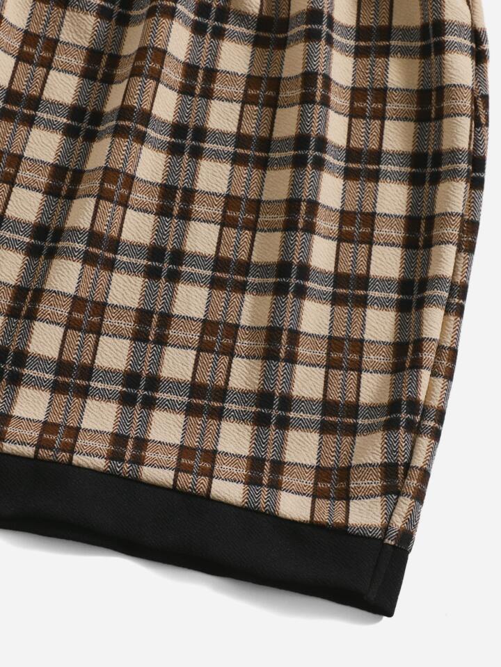 con estampado de cuadros de hombros caídos Top & Falda