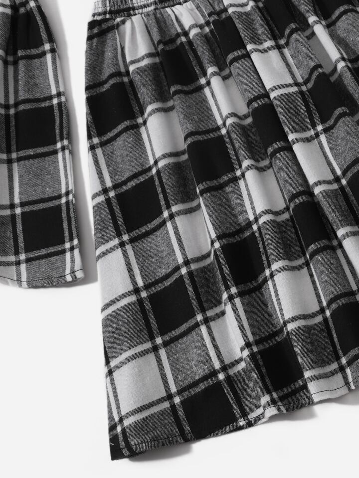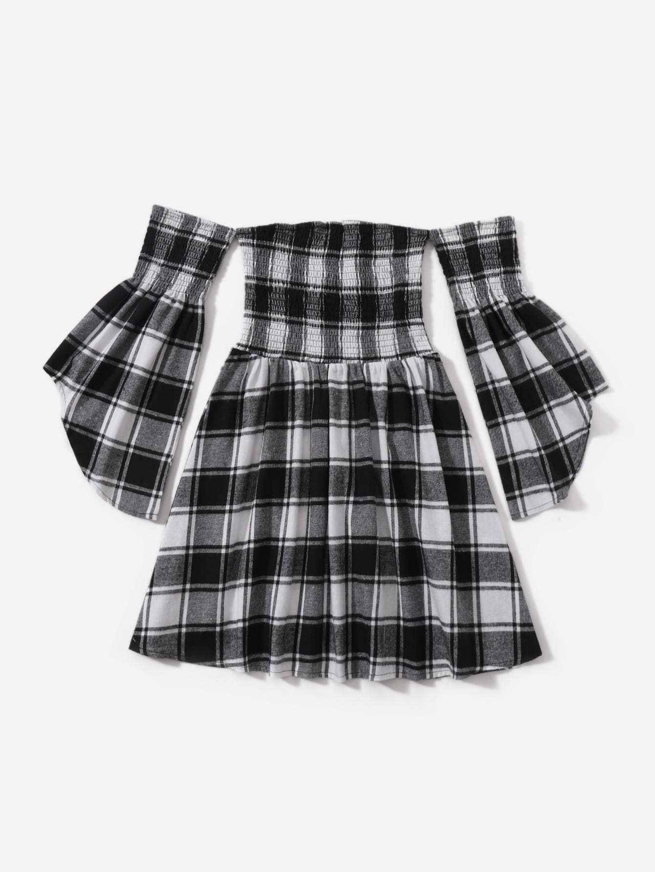 Vestido con fruncido con estampado de cuadros de hombros descubiertos