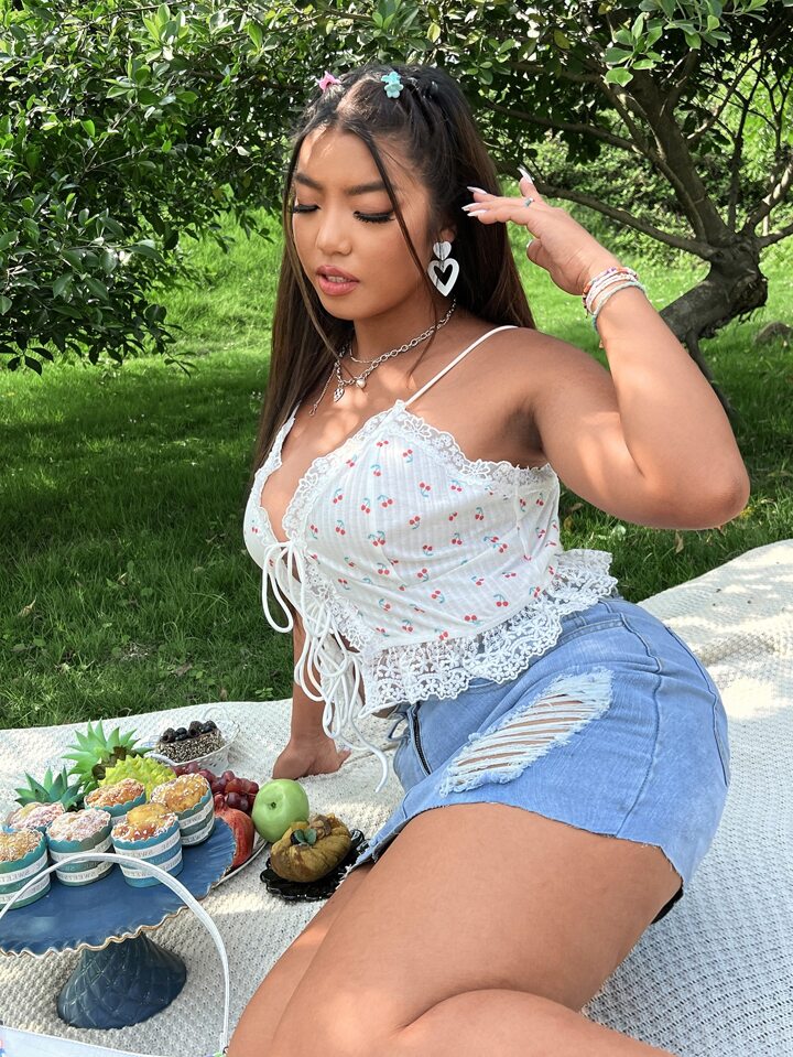 Top de tirantes corto con estampado de cereza ribete con encaje con nudo delantero