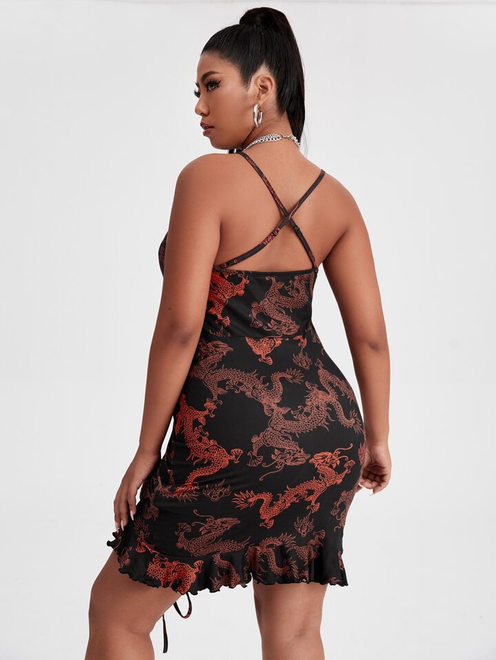 Vestido Plus Con Diseño De Dragón Chino, Espalda Cruzada Con Cordón, Dobladillo Fruncido Con Volantes