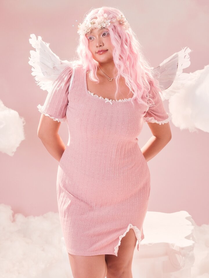 Vestido De Talla Grande Con Encaje De Contraste Y Dobladillo Dividido