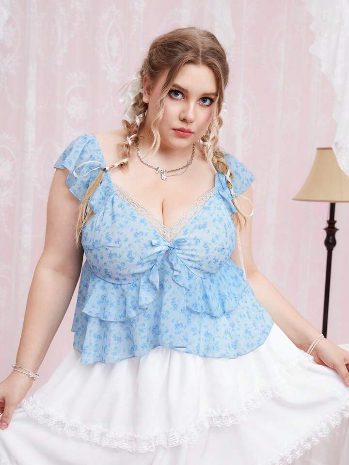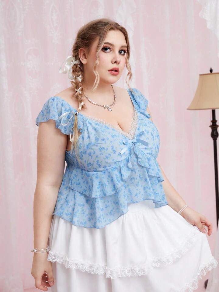 Talla grande Blusa peplum con estampado floral ribete con fruncido