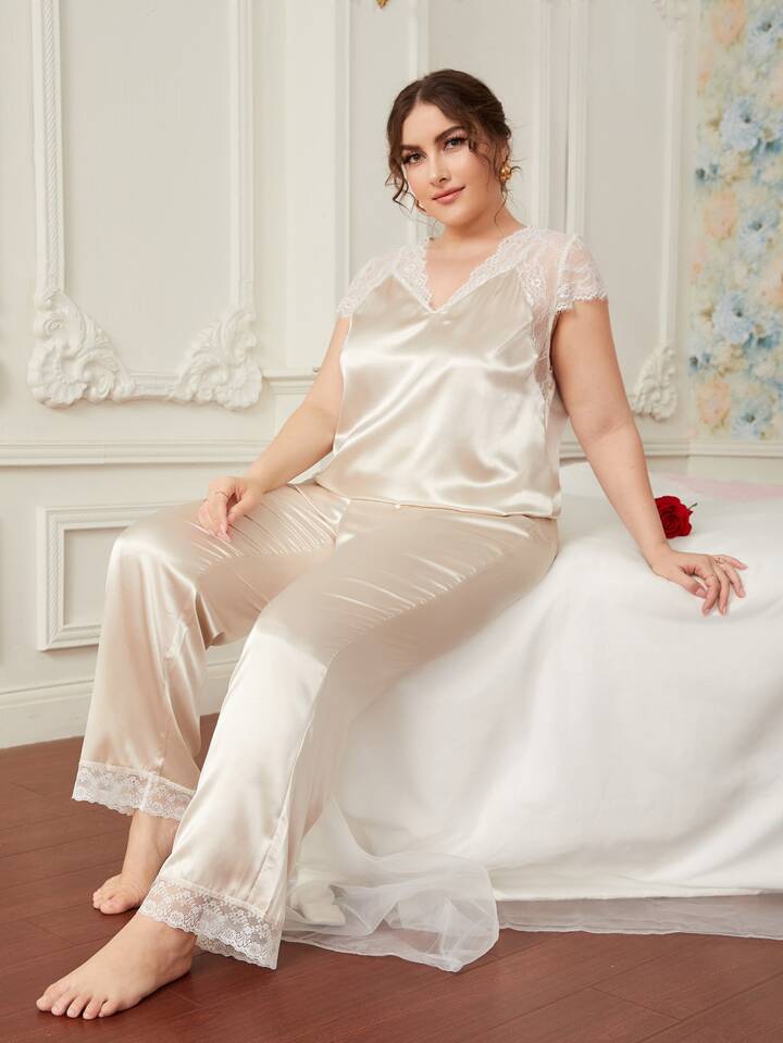 Conjunto de pijama con top de satén y pantalones con panel de encaje de pestañas talla grande