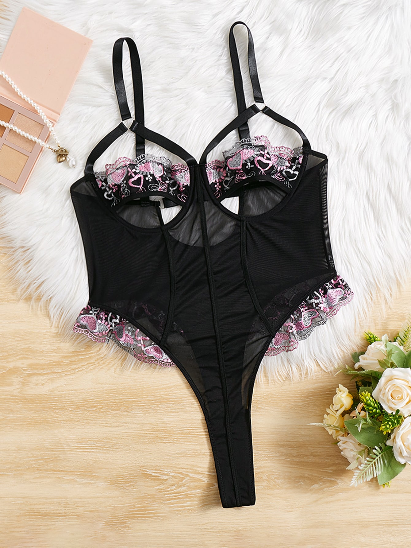 Body teddy con bordado floral de malla con abertura ribete fruncido