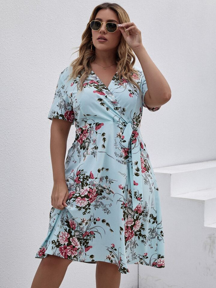 Vestido Largo Plus Con Diseño Floral, Con Cuello Cruzado Con Nudo En Un Costado