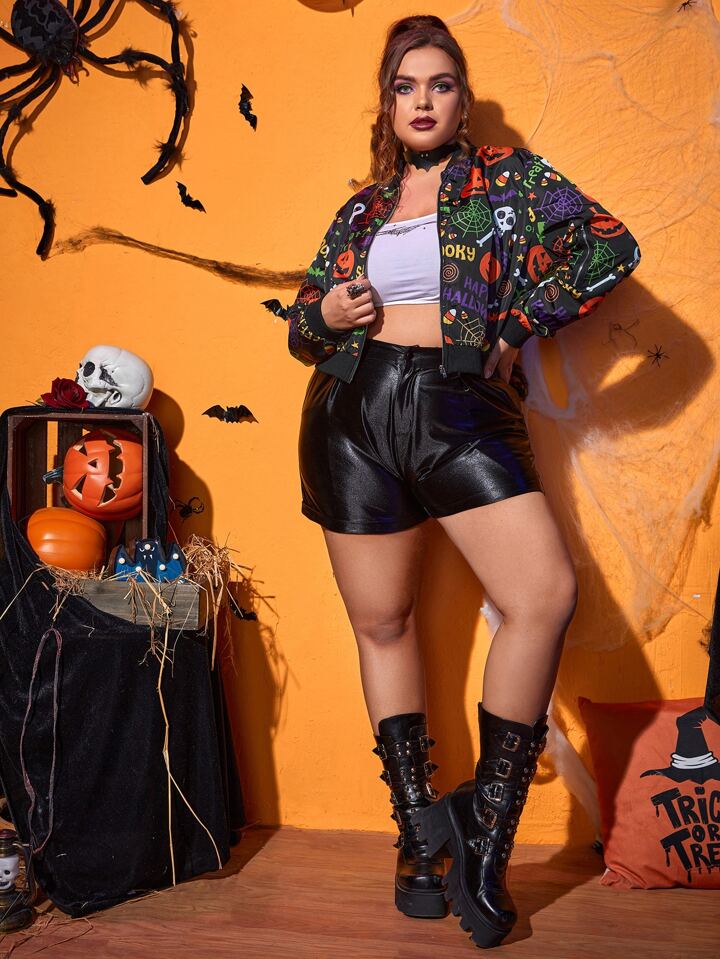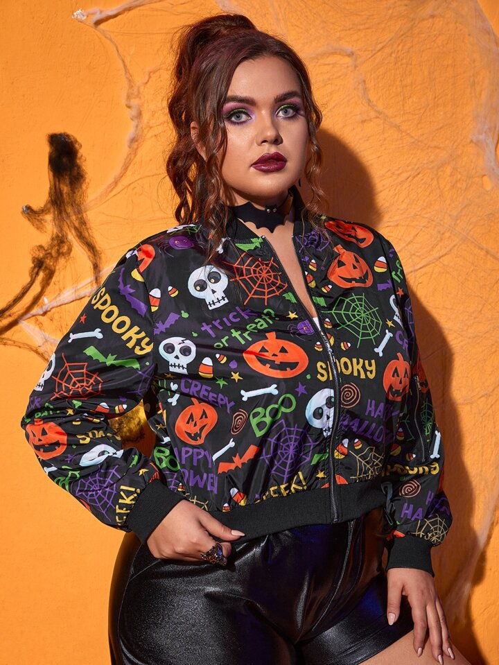 Cazadora tipo bomber con estampado de calabaza y slogan de Halloween