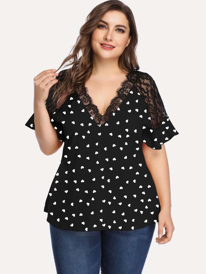 Camisa de manga con volante con encaje en contraste con estampado de corazón