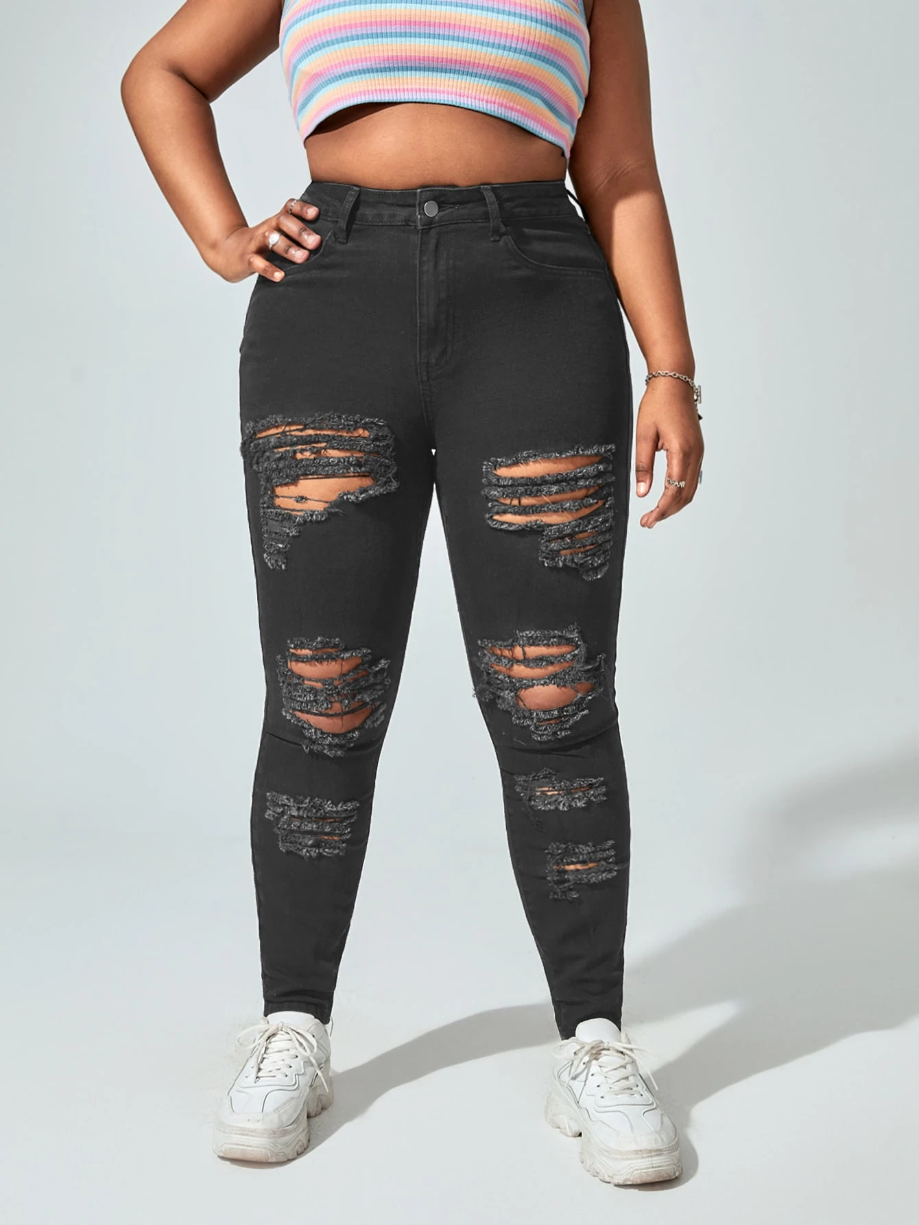Jeans ajustados de talle alto desgarro crudo con abertura