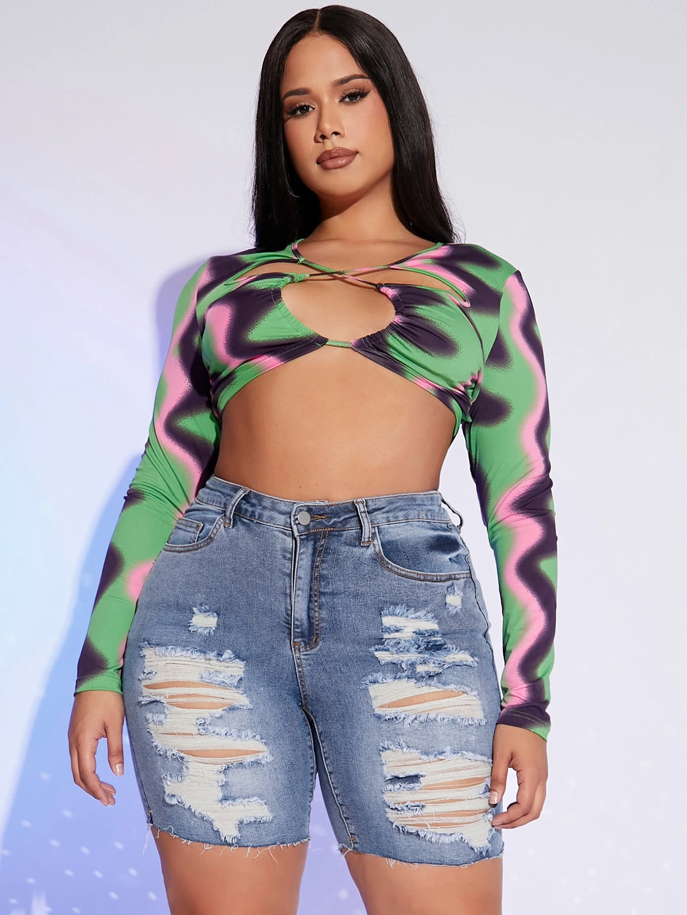 Shorts en mezclilla de talle alto desgarro bajo crudo