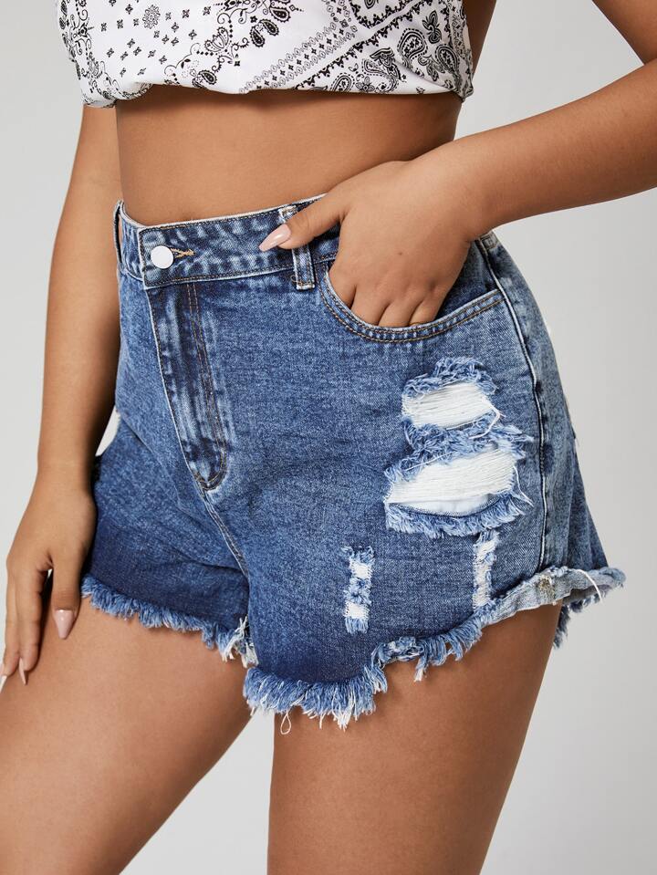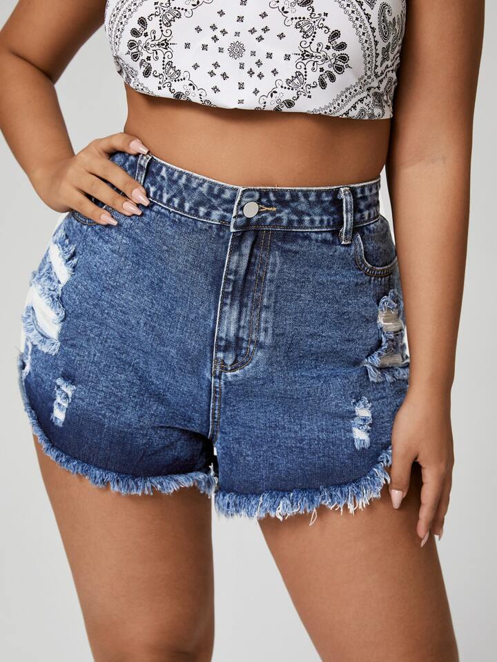 Shorts mezclilla desgarro bajo crudo de talle alto