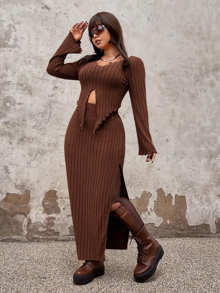 Talla grande ribete en forma de lechuga Camiseta & de muslo con abertura Falda