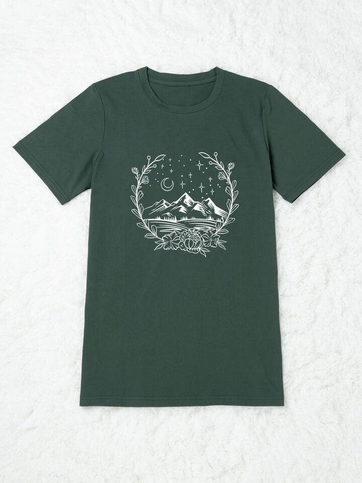 Camiseta gráfica con estampado de montaña y floral para mujer, tallas grandes