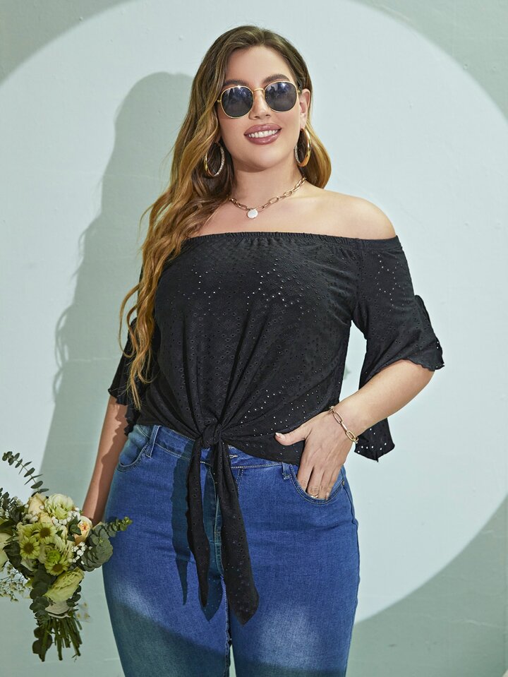 Plus Tamaño De Camiseta Schulfer Despelmada Con Nudos En El Dobladillo