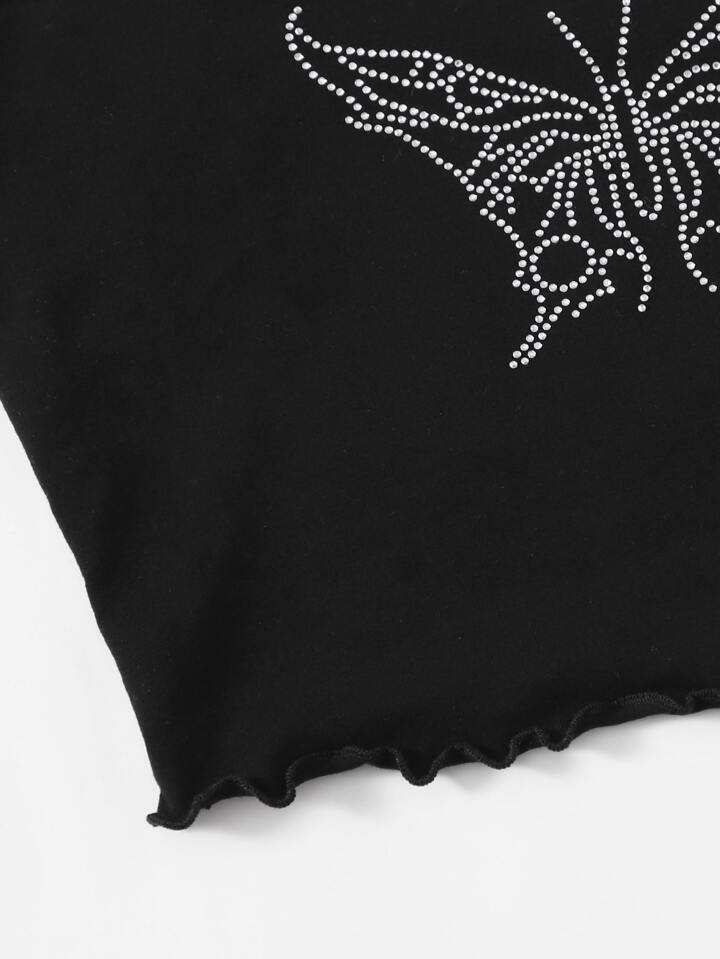 Top de tirantes con diamante de imitación con estampado de mariposa ribete en forma de lechuga