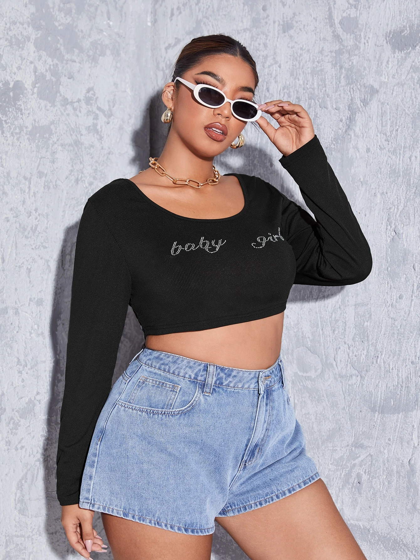 Top corto con diamante de imitación con estampado de letra tejido de canalé