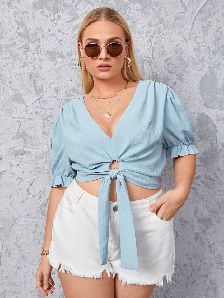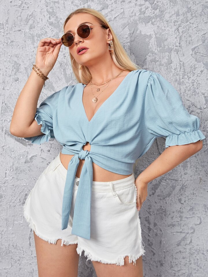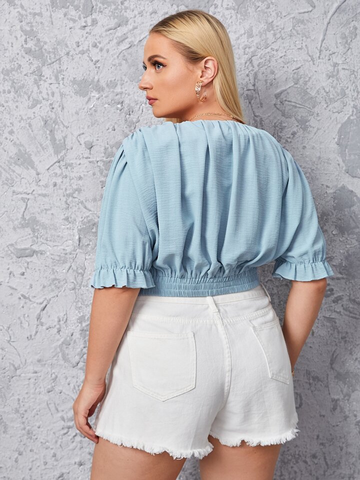 Blusa fruncido de manga con volante escote V bajo con nudo