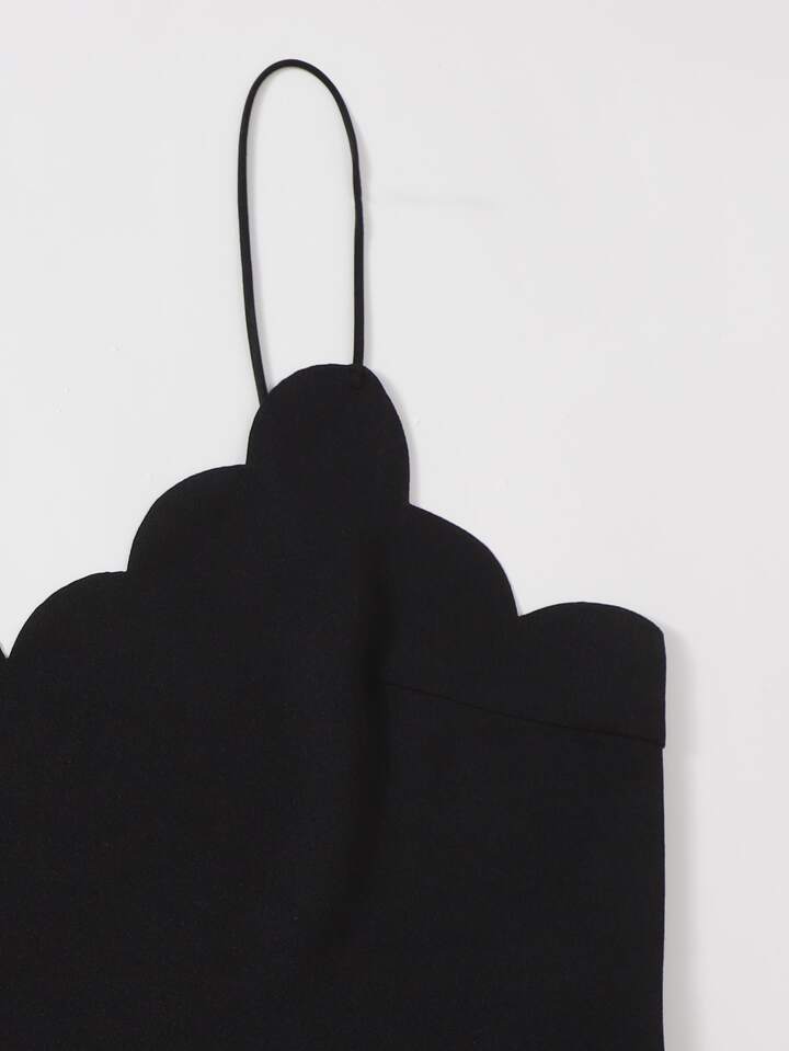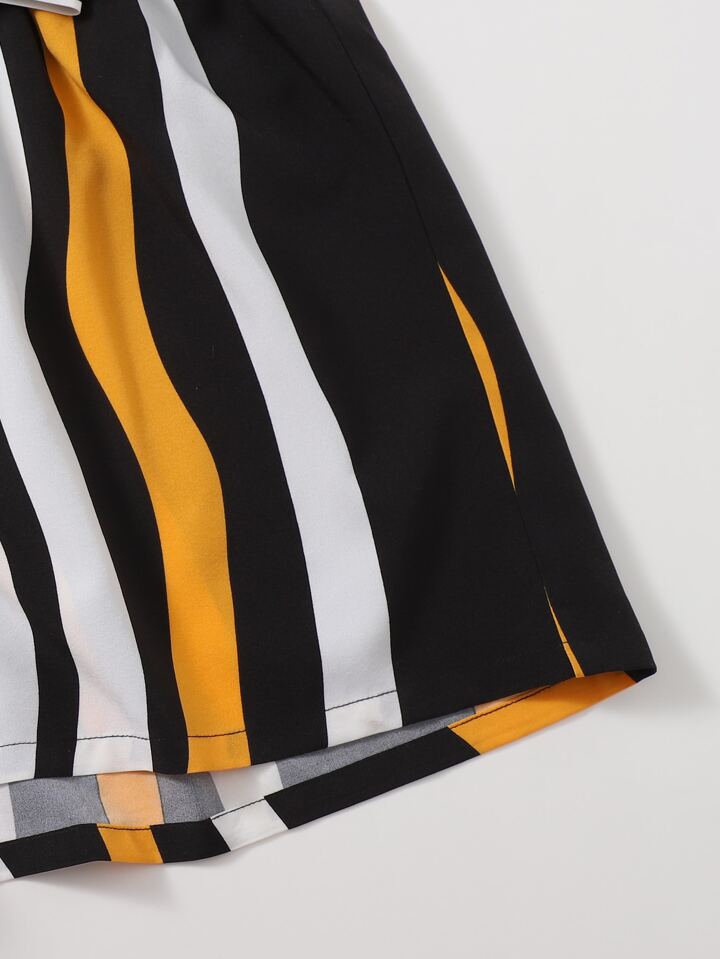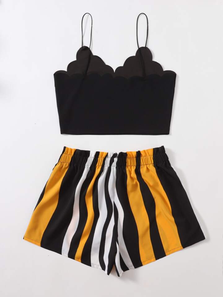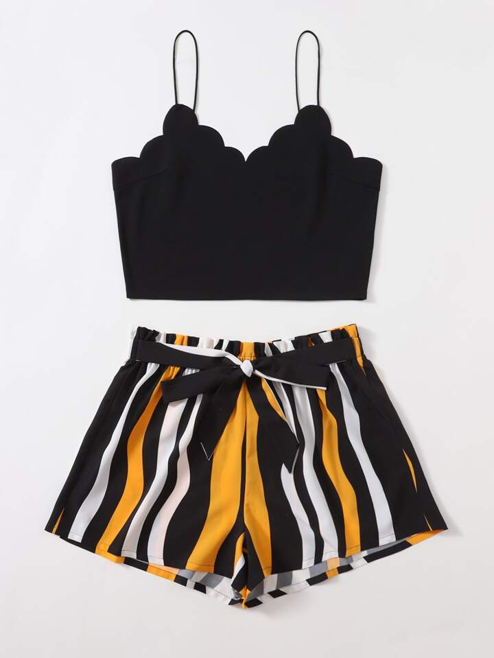 Conjunto top de tirantes ribete en abanico con shorts de rayas con cinturón de cintura con volante