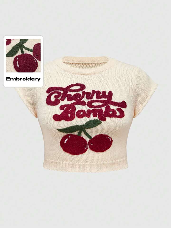 Blusa de talla grande de manga corta con bordado 3D de cerezas en patrón de punto