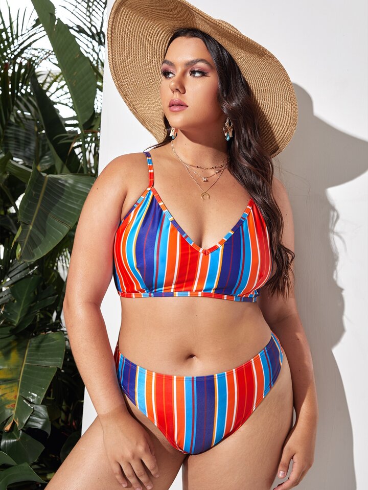 Conjunto de bikini de talle alto con rayas de colores para playa de talla grande