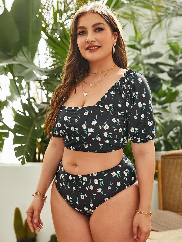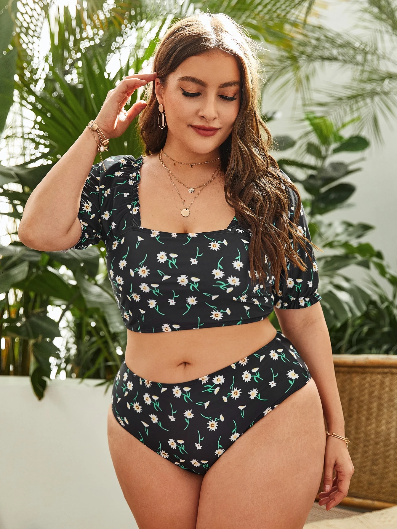 Conjunto de bikini floral menudo talla grande con manga corta para playa de verano