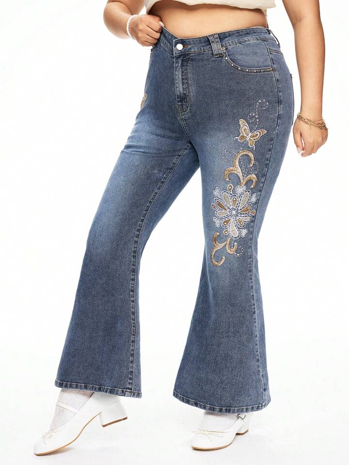 Jeans casuales con bolsillos delanteros, abotonaduras y bordado de mariposa, talla grande