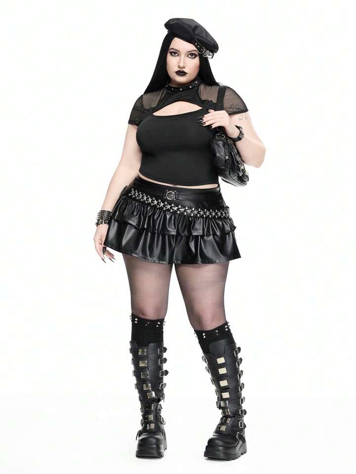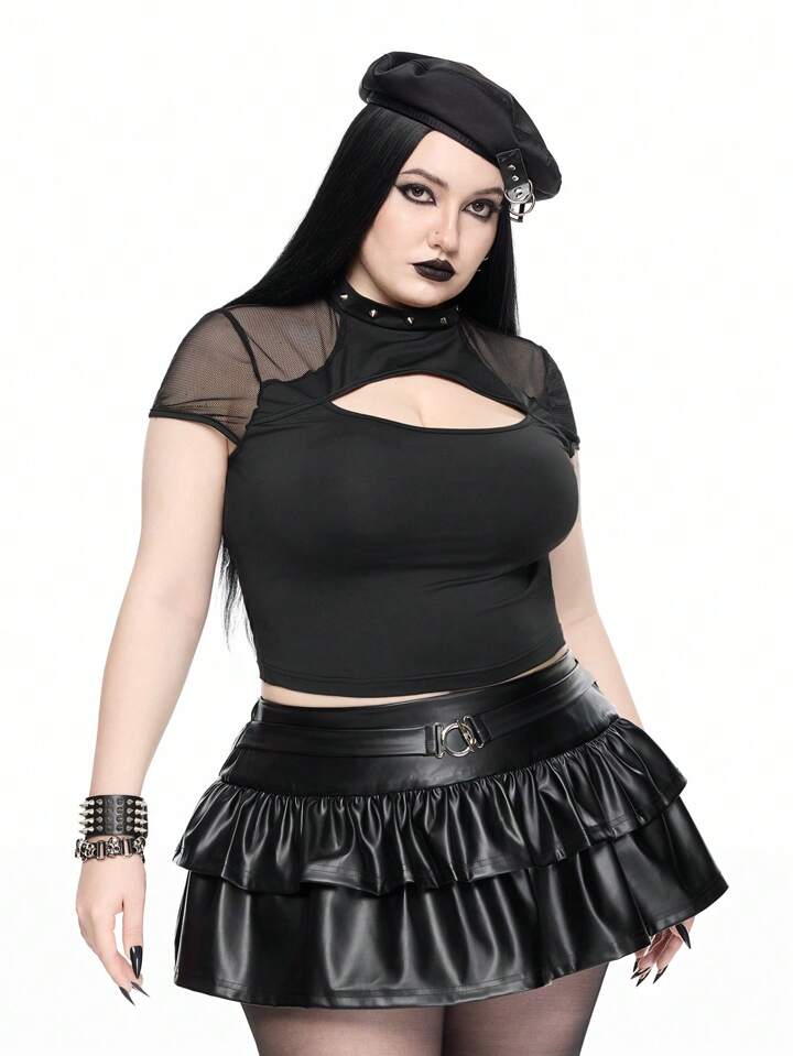 Goth Camiseta gótica sexy de talla grande con cuello de malla con corte por láser, empalmado y decoración de remaches metálicos