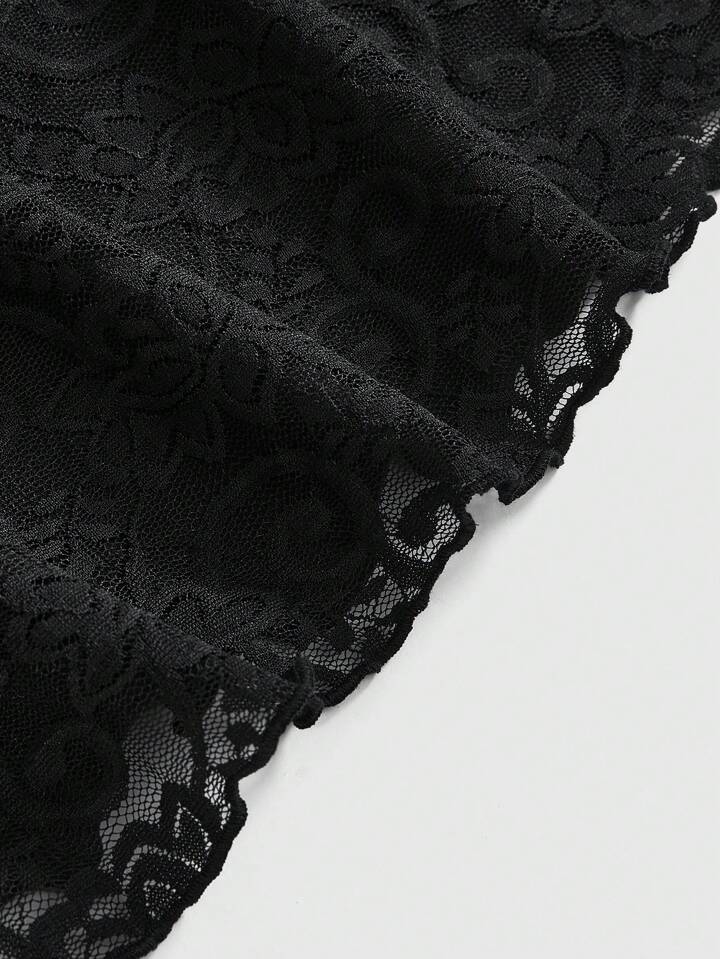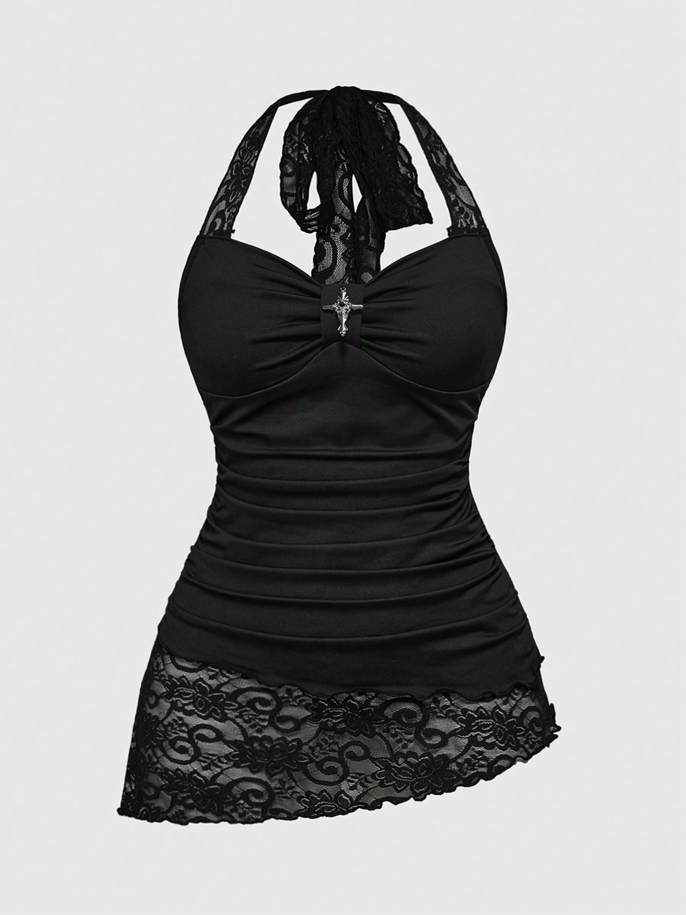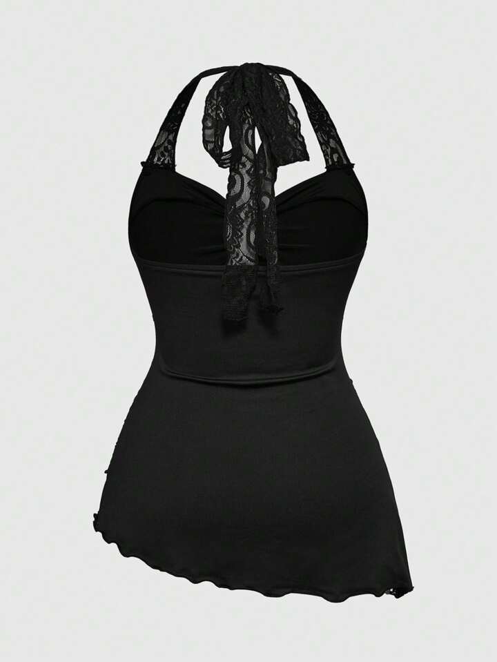 Camiseta de tirantes con cuello halter, espalda con lazo y dobladillo asimétrico con encaje y parches de encaje para mujer talla grande