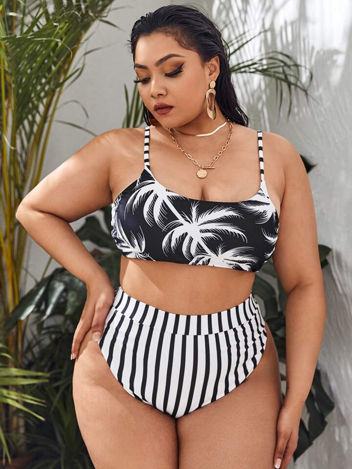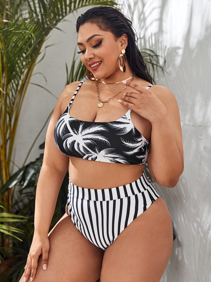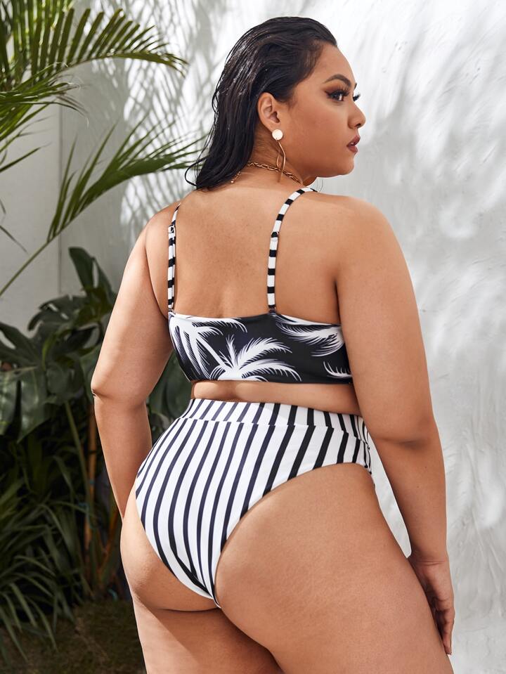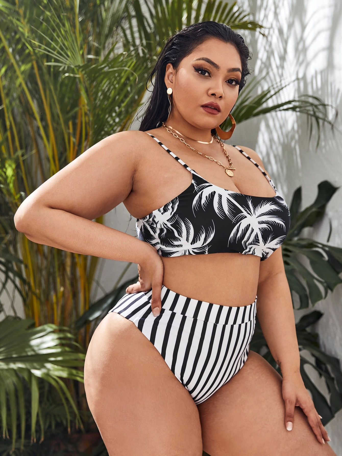 Conjunto de bikini con estampado de palma y rayas para tallas grandes, playa de verano