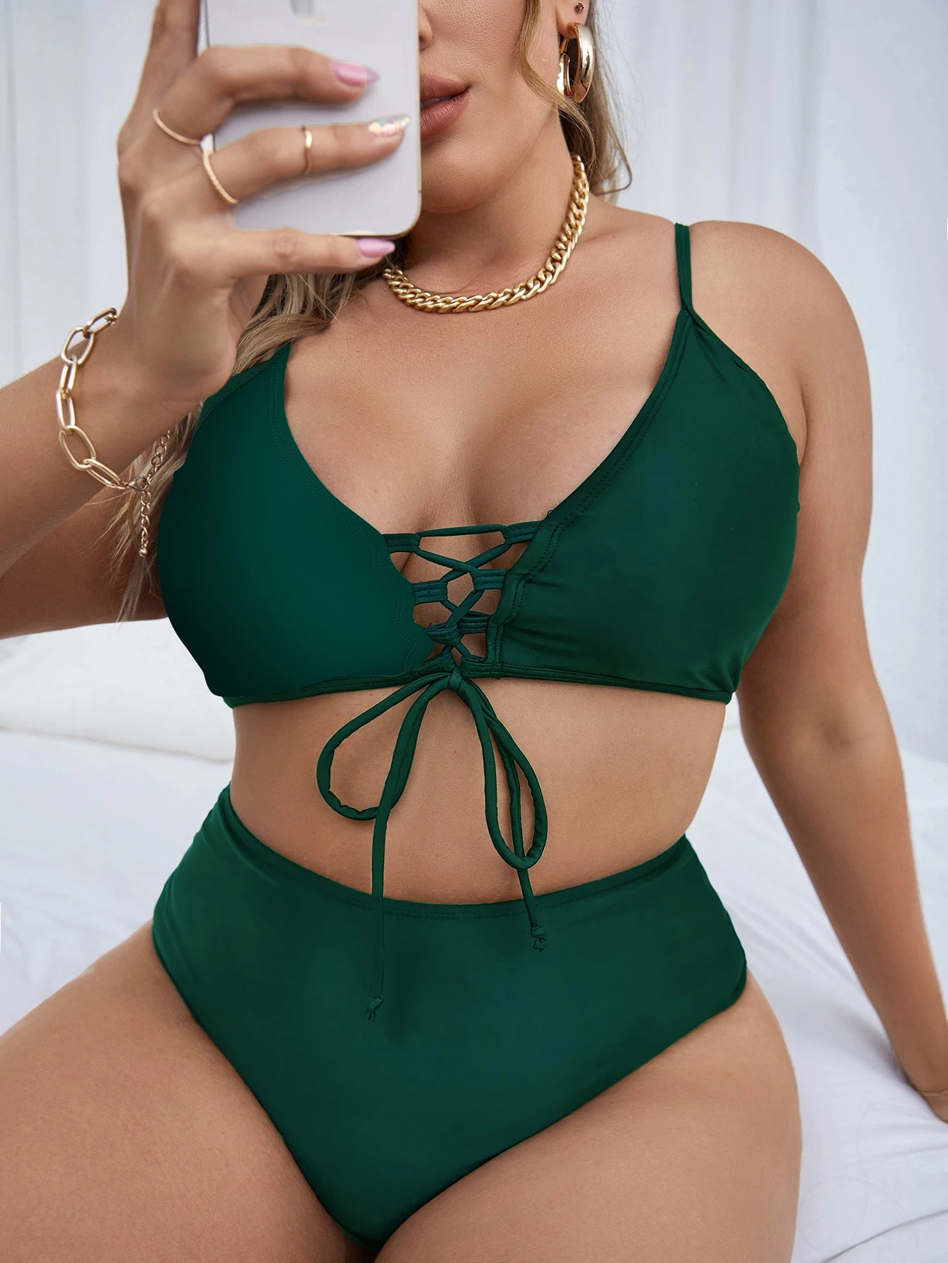 Conjunto de bikini de talla grande de cintura alta con cordones planos y encaje, ideal para la playa en verano